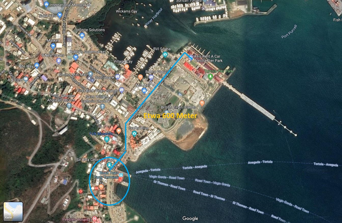 Für all jene, die noch nicht auf Tortola (Road Town) waren und nicht wissen, wo der Fährhafen ist
