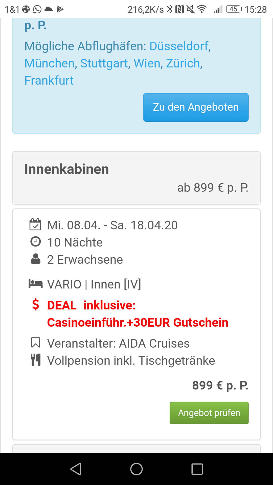 Bei Aida Vario kostet die Reise wenn ich sie eingebe aber deutlich mehr in der Innenkabine, ich meine es waren eben 2098 Eur für zwei. Die Preise für Meerblick sind in den letzten Wochen konstant gestiegen nachdem es am Cybermonday einen krassen Preisverfall gab.