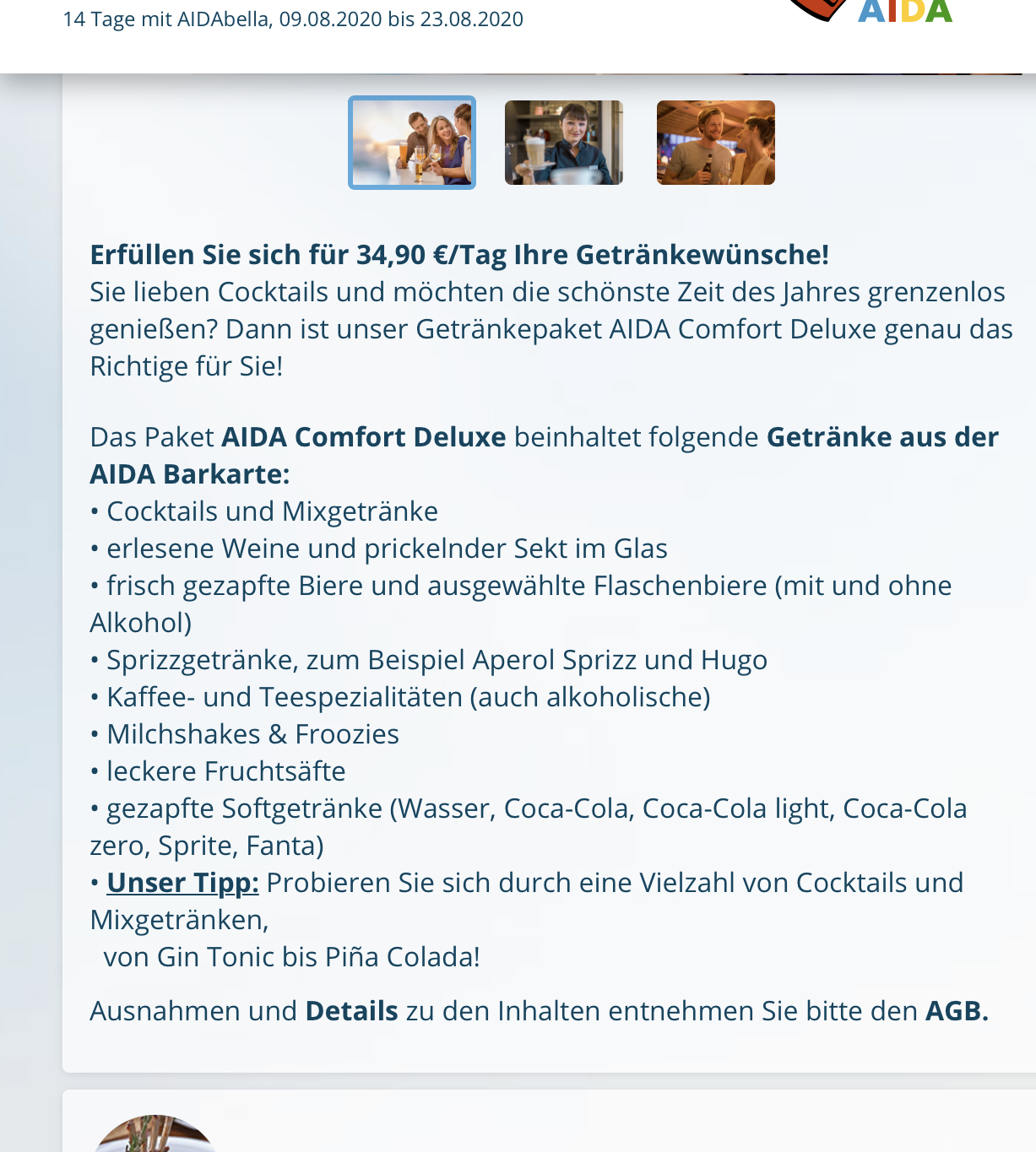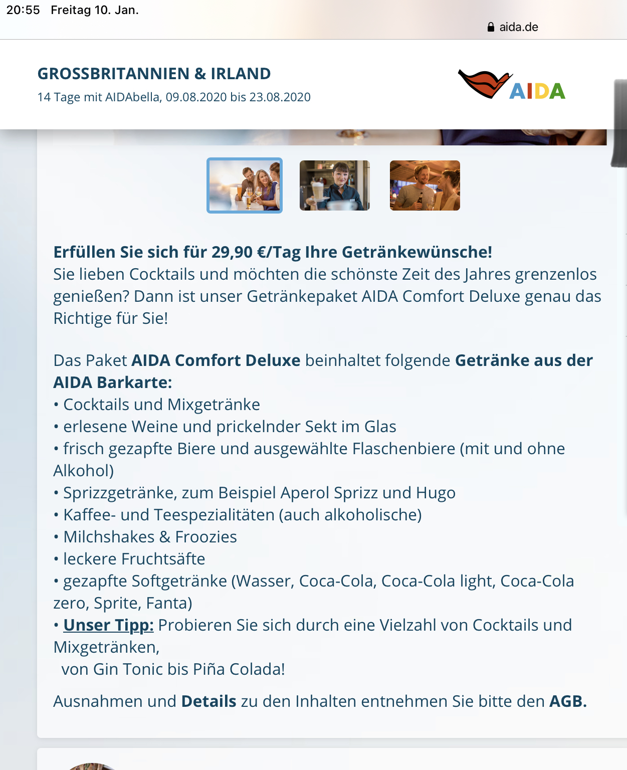 ich weiß nicht ob ich dass so verlinken darf und ob es jemand schon aufgefallen ist. Auf der Aida Homepage wurde das Übersichtsblatt zu den Getränkepaketen am 09.01.2020 angepasst. Und wie durch ein Wunder ist das Sternchen, das bislang die Ausnahmen für den höheren Preis bei den Getränkepaketen festgelegt hat, verschwunden. Jetzt steht hier nur noch z.B. beim Comfort Deluxe 29,90€ bzw. 34,90€ je nach Route. Scheint also jetzt Aida festzulegen wann welcher Preis gilt. Auch bei den Beschreibungen der Pakete auf der Homepage sind die Sternchen verschwunden...