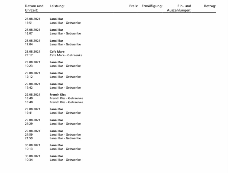 Auf meiner Bordrechnung sieht man lediglich, dass Getränke geordert worden und in welcher Bar. Aber weder ist zu erkennen, welches Getränk, noch, welcher Preis. Wenn das bei anderen anders ist, gut. Bei mir (und offensichtlich auch bei anderen) ist eben nicht. Da hilft dann auch kein "definitiv".