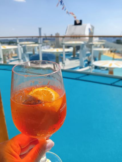 Da scheint es ja große Unterschiede zwischen den Schiffen zu geben, solche lieblose Darreichung haben wir auf der Perla nie gehabt, der Aperol Sprizz kam im richtigen Glas, und auch die alkoholfreien Cocktails waren immer richtig dekoriert. Vielleicht war mal ein bisschen zuviel Eis dabei, aber so armselig sah nie ein Getränk auf unserer tour aus.