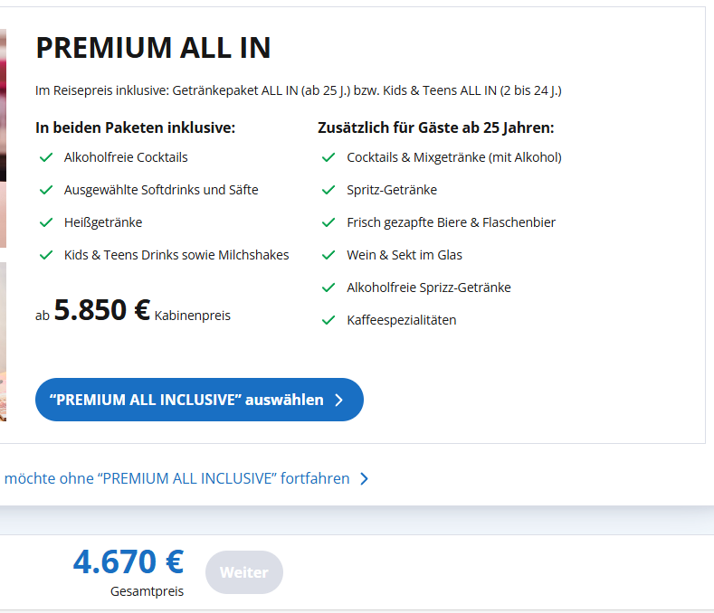 Noch weniger Preisunterschied (Innenkabine) mit und ohne AllIn sind die von mir genannten 590 Euro pro Person: Schau mal. Beim "Nachbuchen" ist All-In dem alten Getränkepaket gleichzusetzen. Damals war das Getränkepaket auch immer teurer ...