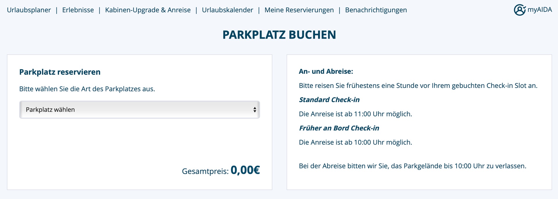 Hatten auch Check-in 10 Uhr und Parkplatz über Aida gebucht. Konnten zwar direkt in Steinwerder auf den Parkplatz- Schranke, aber leider war kein Ansprechpartner von Aida da, der uns sagen konnte, wo wir parken dürfen. War alles etwas umständlich. Letztens über Parken und Meer gebucht, das hat besser geklappt.