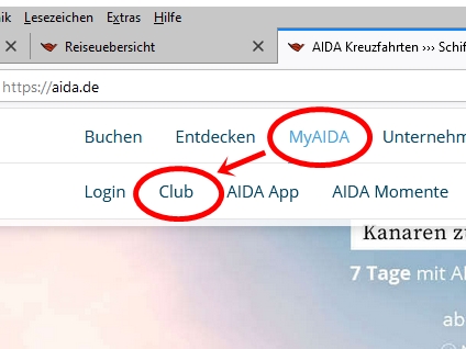 3. Im Browser einen neuen Tab öffnen, über MyAIDA auf Club klicken.