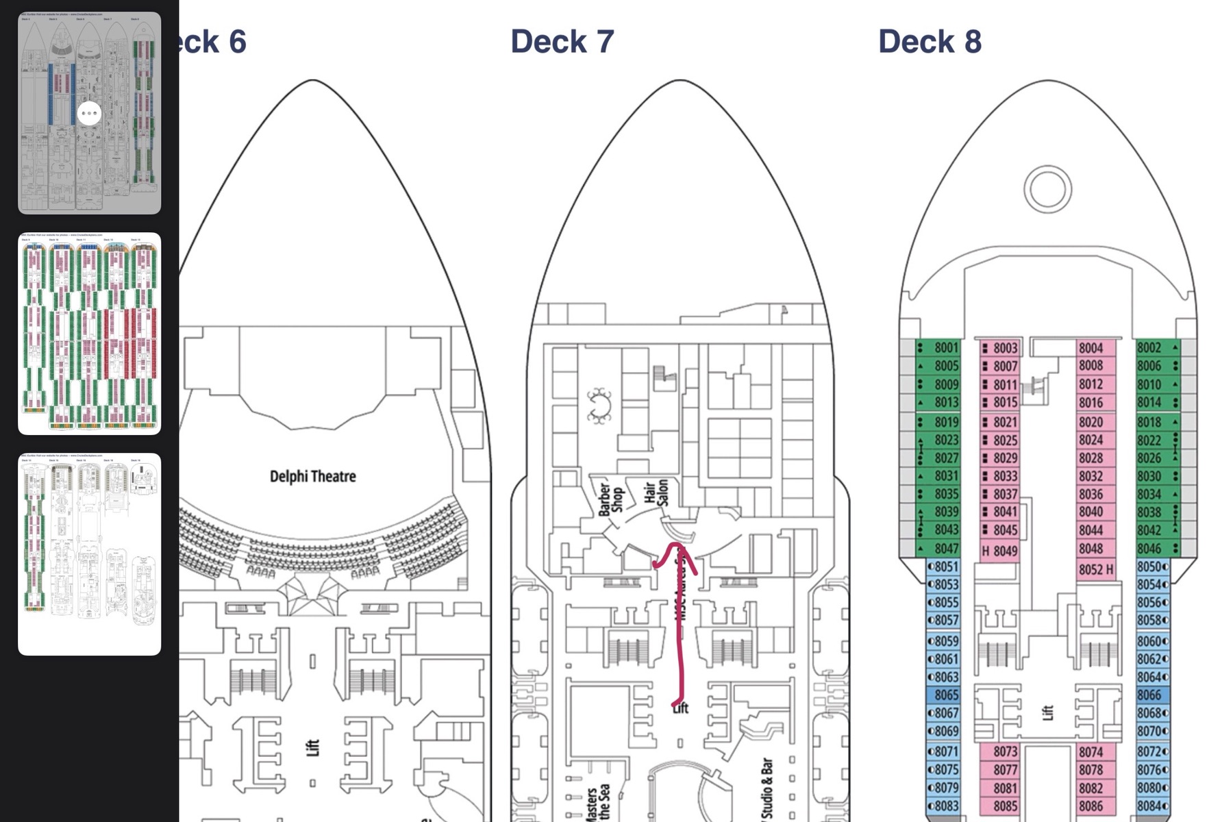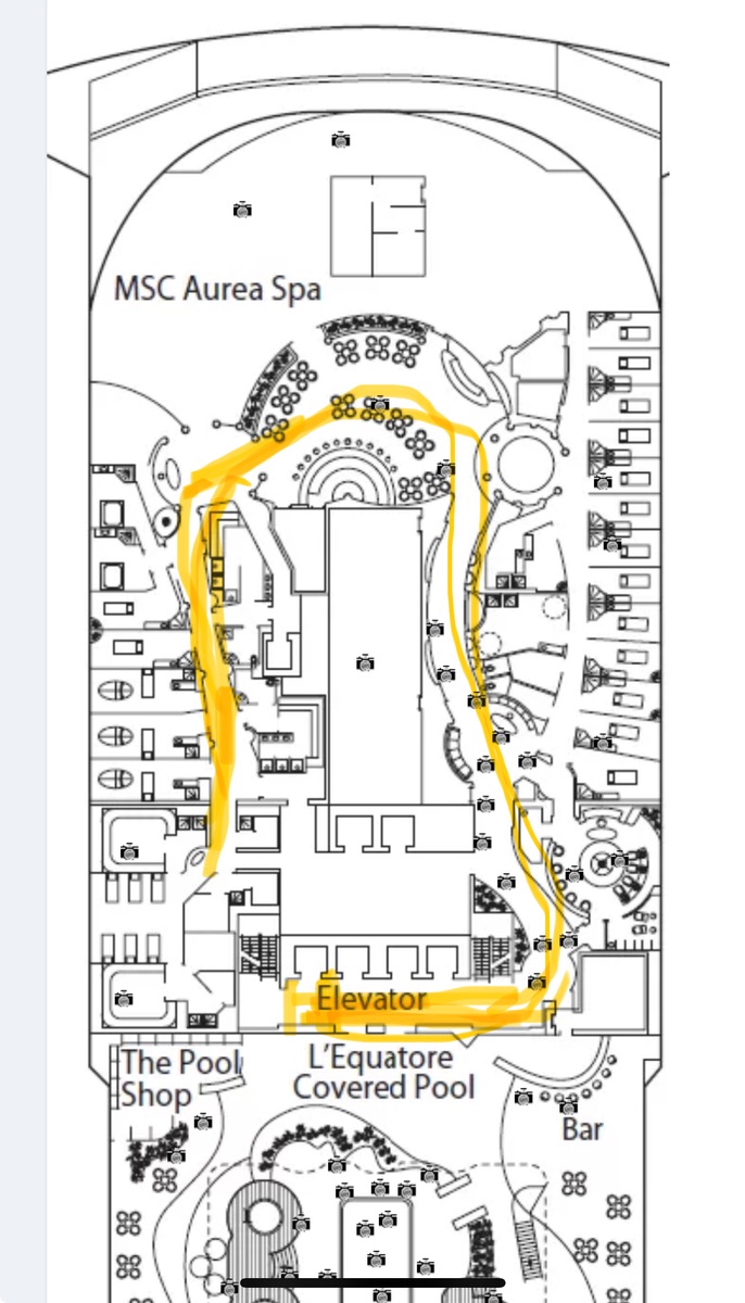Das von mir gelb eingezeichnete wäre der Weg im Deck des Aurea Spas von dem Lift außerhalb des Yachtclubs aus, der aber auch eine Prioschaltung für Yachtclubgäste hat, wenn man die Karte stect, den msn gehen müsste, um vom Lift aus durch zunächst öffentliche Bereiche mit dem angezogenen Bademantel zu den Saunen zu kommen: