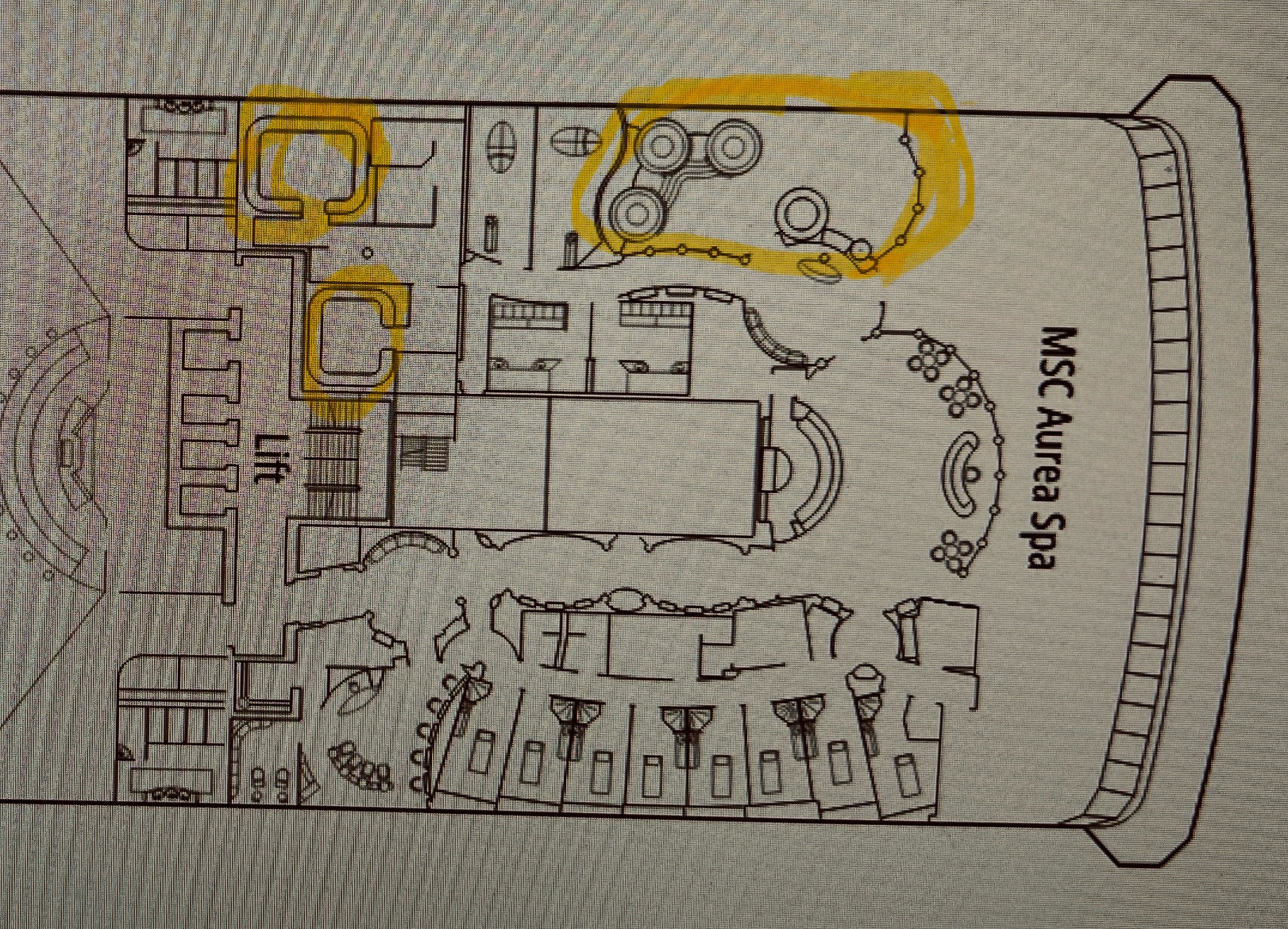 Gelb markiert habe ich Sauna + Dampfbad + Ruhebereich mit drei unterschiedlich warmen Whirlpools. Welche allen AureaSpa Gästen inkludiert zur Verfügung standen/stehen. Der Raum mit den drei Whirlpools ist seitlich voll verglast. Man hat somit sowohl von den Whirlpools aus als auch von den Liegen in dem Raum eine super Aussicht auf die vorbei ziehende Landschaft, während das Schiff fährt.