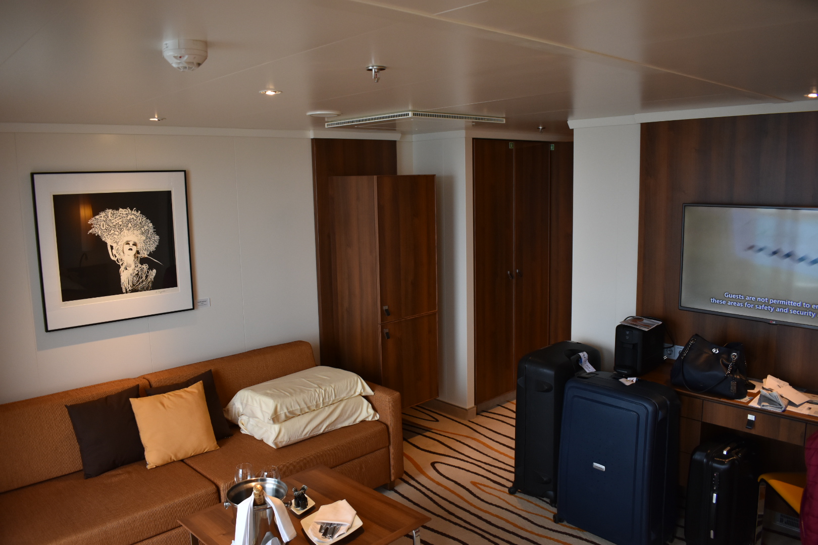 Die Kabine befindet sich Backbord auf dem Patio-Deck mit direktem Zugang zu den Pools, Bar und Sitzgelegenheiten und Liegen. Das Patiodeck ist für alle mit Patio Kabinen und Suiten zugänglich - auch mit Kindern, was bei dem ein- oder anderen für "Überraschung" gesorgt hat.