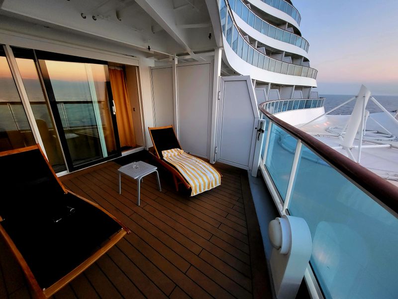 Es handelt sich um eine Junior Suite für bis zu vier Personen am Heck. Wenn man in die Suite kommt sind linker Hand die Schränke, mit einem Spiegel dazwischen vor dem eine große Ablage ist. Geradeaus sieht man den Balkon und das Meer.