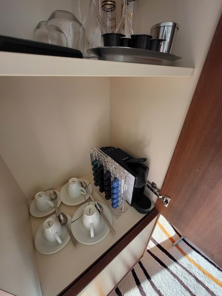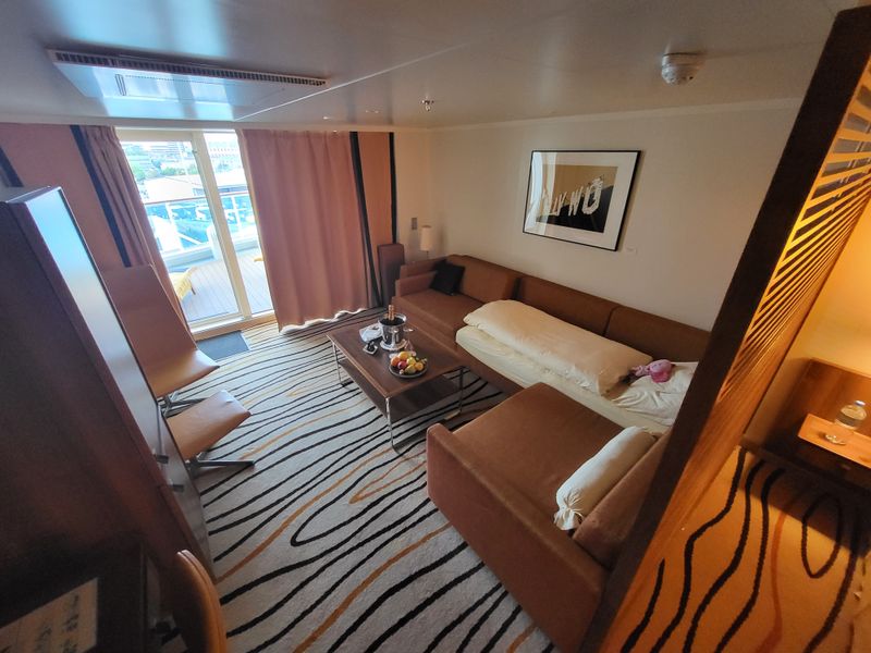 Es handelt sich um eine Junior Suite für bis zu vier Personen am Heck. Wenn man in die Suite kommt sind linker Hand die Schränke, mit einem Spiegel dazwischen vor dem eine große Ablage ist. Geradeaus sieht man den Balkon und das Meer.