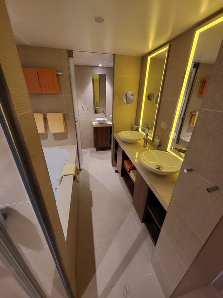 Im Bad ist eine Waschtisch mit je zwei Becken und Spiegeln (mit Leuchtrahmen) und der auf der prima übliche beleuchtete Schminkspiegel. Gegenüber ist eine Badewanne mit Whirlpool-Düsen. Daneben, gegenüber der Badezimmertür ist eine große Dusche.