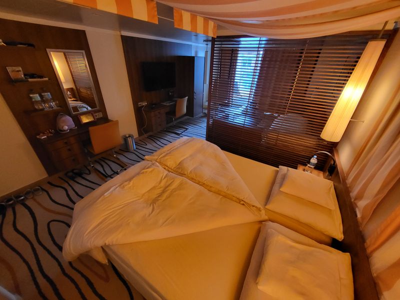 Es handelt sich um eine Junior Suite für bis zu vier Personen am Heck. Wenn man in die Suite kommt sind linker Hand die Schränke, mit einem Spiegel dazwischen vor dem eine große Ablage ist. Geradeaus sieht man den Balkon und das Meer.