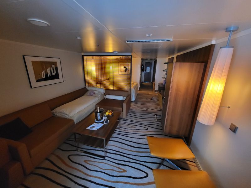Es handelt sich um eine Junior Suite für bis zu vier Personen am Heck. Wenn man in die Suite kommt sind linker Hand die Schränke, mit einem Spiegel dazwischen vor dem eine große Ablage ist. Geradeaus sieht man den Balkon und das Meer.