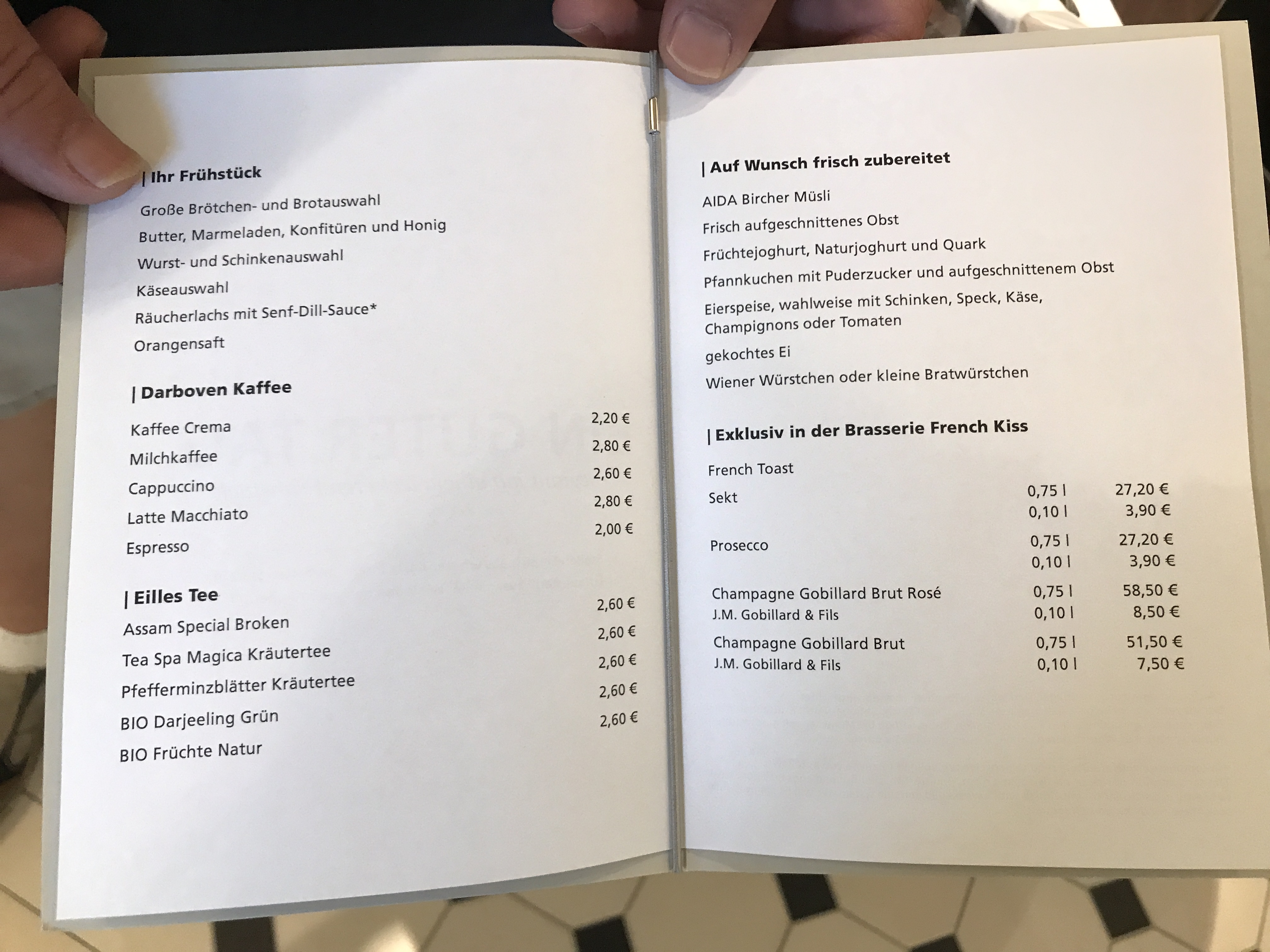 So war die Frühstückskarte vor zwei Wochen auf der Prima im "Frech Kiss". Alles auf der Karte inkl., Sekt, Tee und Kaffee musste man zuzahlen. Wir hoffen, dass das Angebot auch auf der Perla so sein wird. War sehr angenehm.
