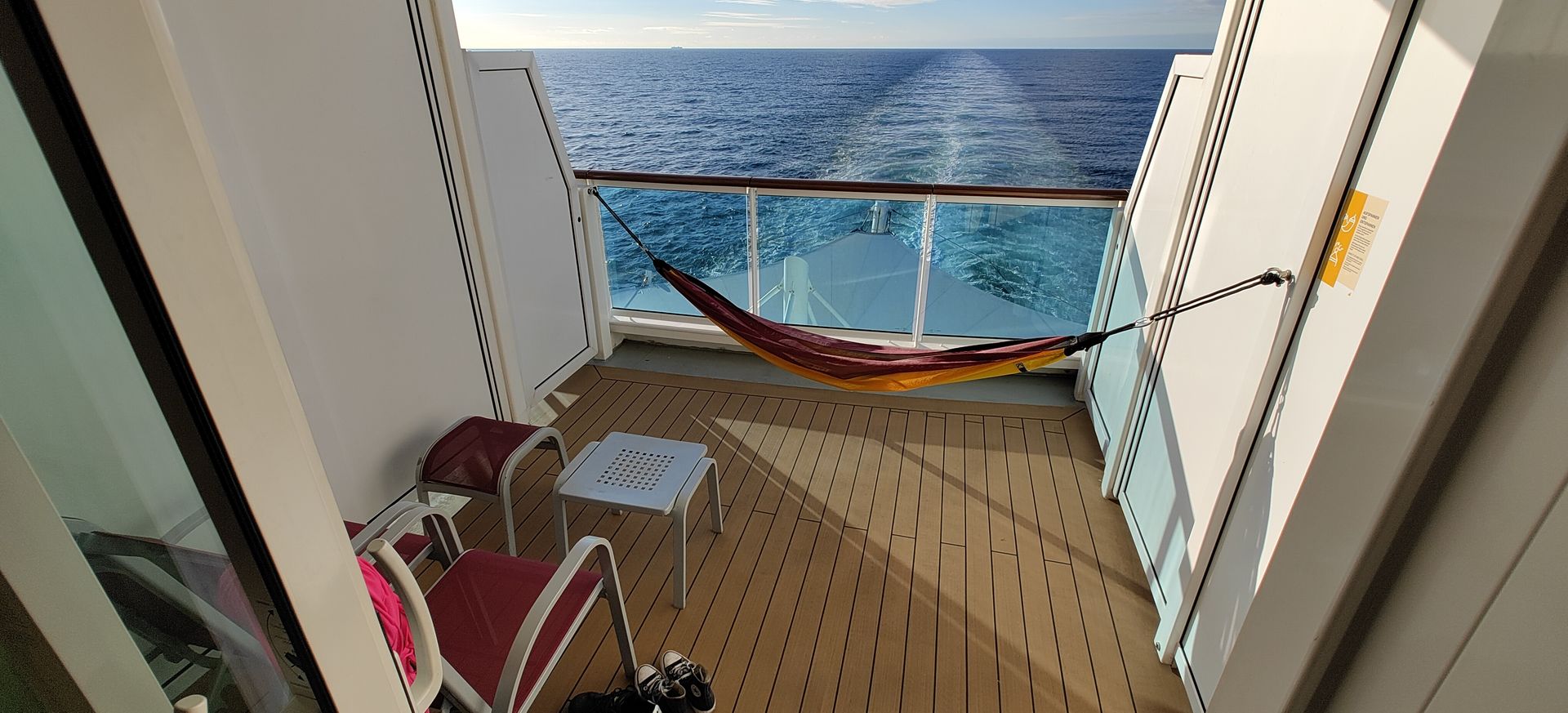 - Richtig klasse war die Veranda. Sie ist recht groß, nicht einsehbar (es sei denn die Nachbarn schauen direkt rein, kam aber nicht vor). In den Häfen schaut man nie direkt auf Container, sondern entweder auf ein anderes Schiff oder auf Wasser. Wind hatten wir auf der Veranda nie, die Veranda war einfach immer zu nutzen bei Regen, bei Sonne, bei Wind. Einfach Klasse. Und die Getränke sind von der LanaiBar schnell besorgt.