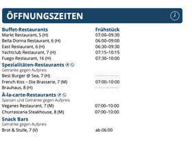 Bezüglich der Restaurant Öffnungszeiten, zumindest der Best Burger@Sea und die Streetfood Meile mit Döner und Co. sollten doch um 12:00Uhr geöffnet haben, oder? Um 13:00Uhr müssen wir das Schiff verlassen und wir würden gerne vorher etwas zu Mittag essen.