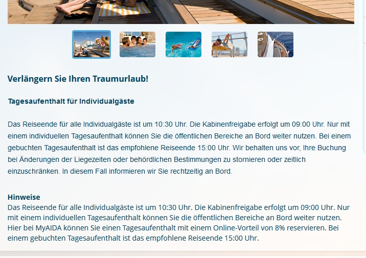 Ich konnte bis 15 Uhr an Bord bleiben. Die Rezi an Bord kannte sich gar nicht aus, wollte dass ich um 13 Uhr von Bord gehe. Aber ich hatte recherchiert und damals stand bei Tagesaufenthalt, bis 11 Uhr Kabine verlassen, bis 15 Uhr das Schiff verlassen.