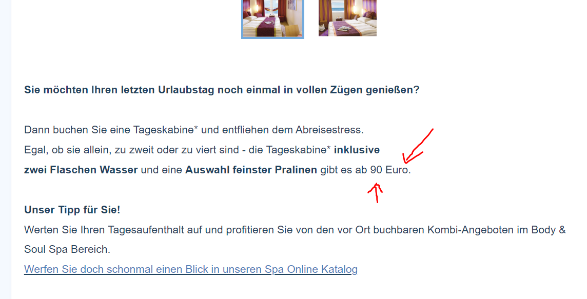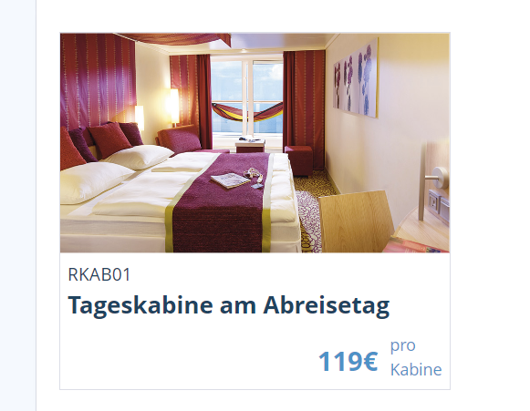 Ich konnte bis 15 Uhr an Bord bleiben. Die Rezi an Bord kannte sich gar nicht aus, wollte dass ich um 13 Uhr von Bord gehe. Aber ich hatte recherchiert und damals stand bei Tagesaufenthalt, bis 11 Uhr Kabine verlassen, bis 15 Uhr das Schiff verlassen.