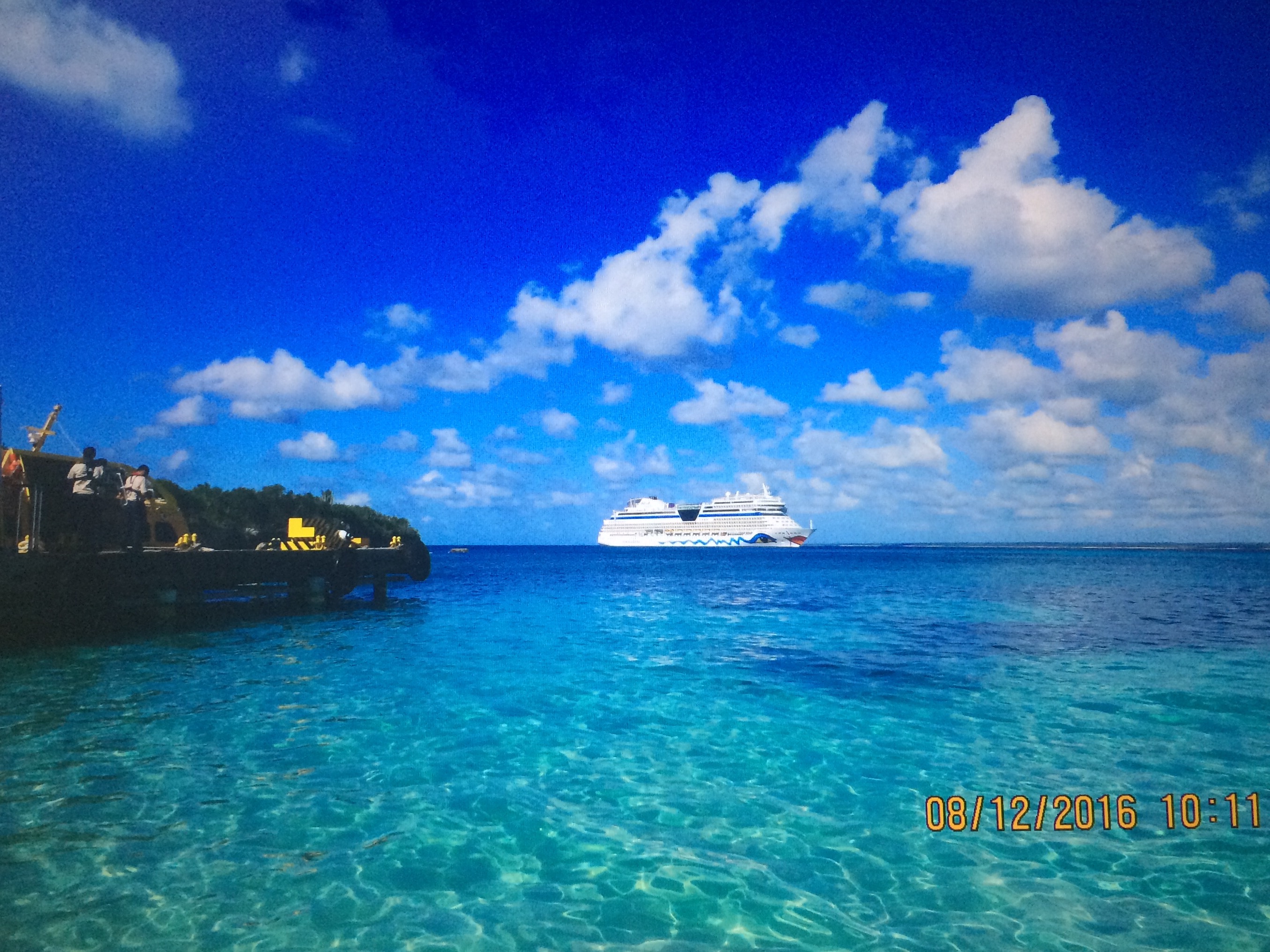 Dort erstmal ein kleiner Schock. Gefühlt 2.000 Aida Gäste lagen dicht gedrängt nebeneinander auf den kostenlosen Liegen am kleinen Sandstrand direkt am Anleger der Tenderboote.