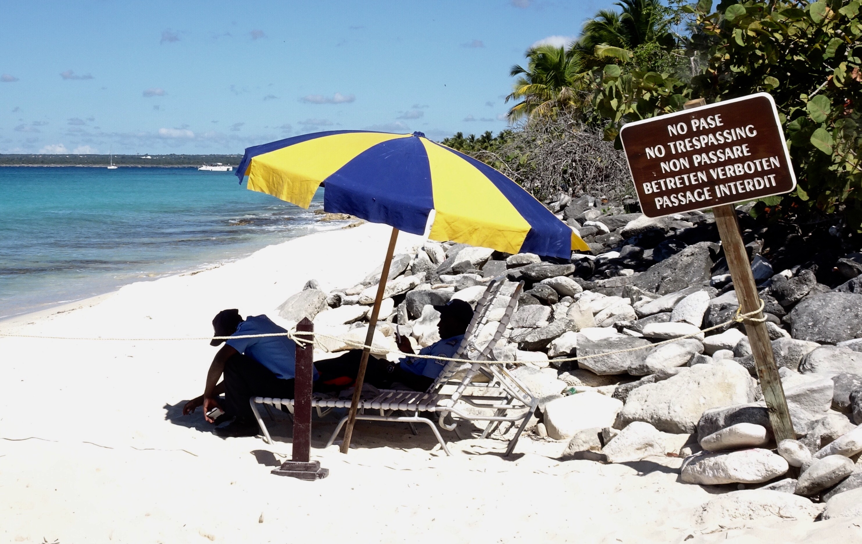 Dahinter: menschenleerer Karibikstrand .... zwar ohne Liegen, aber dafür auch ohne Gedränge. Nur leider auch ohne uns. Alle Bestechungsversuche halfen da nicht.
