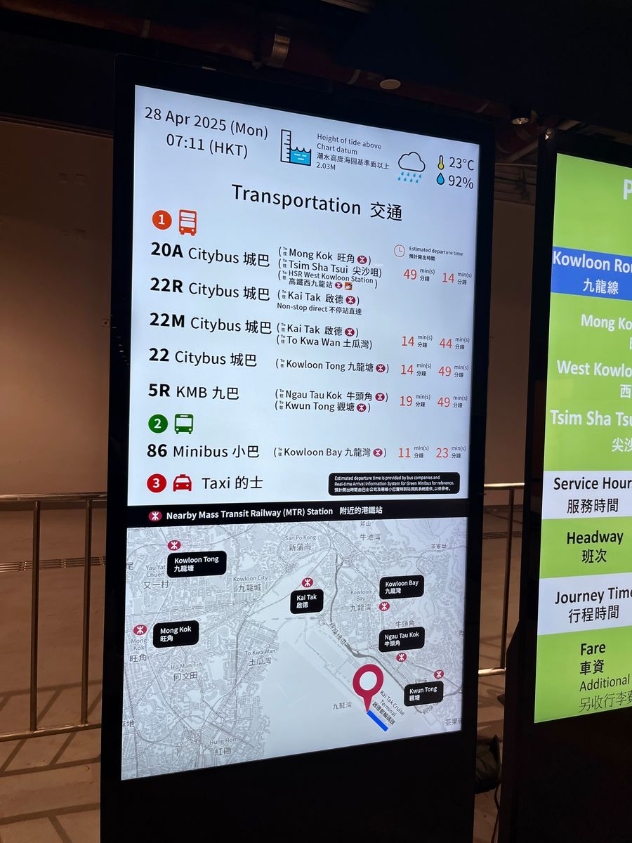 Vom Kai Tak Terminal kommt man mit den öffentlichen Bussen ebenfalls gut ins Zentrum von HK. Der Weg zum Bus ist im Terminal gut ausgeschildert. Die Abfahtszeiten aus dem Internet stimmten überein und lassen sich vorab hier überprüfen: https://mobile.citybus.com.hk/nwp3/. Dort einfach bei Route die Busnummer eingeben und dann Richtung auswählen.