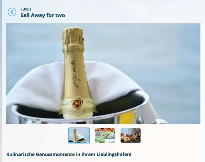 Man geht zur Rezeption, nennt seine Kabinennummer und wählt den Hafen aus, von welchem man aus das Paket genießen möchte. Pünktlich zum Auslaufen bringt man euch dann eine Auswahl an kleinen herzhaften und süßen Speisen sowie den Champagner.