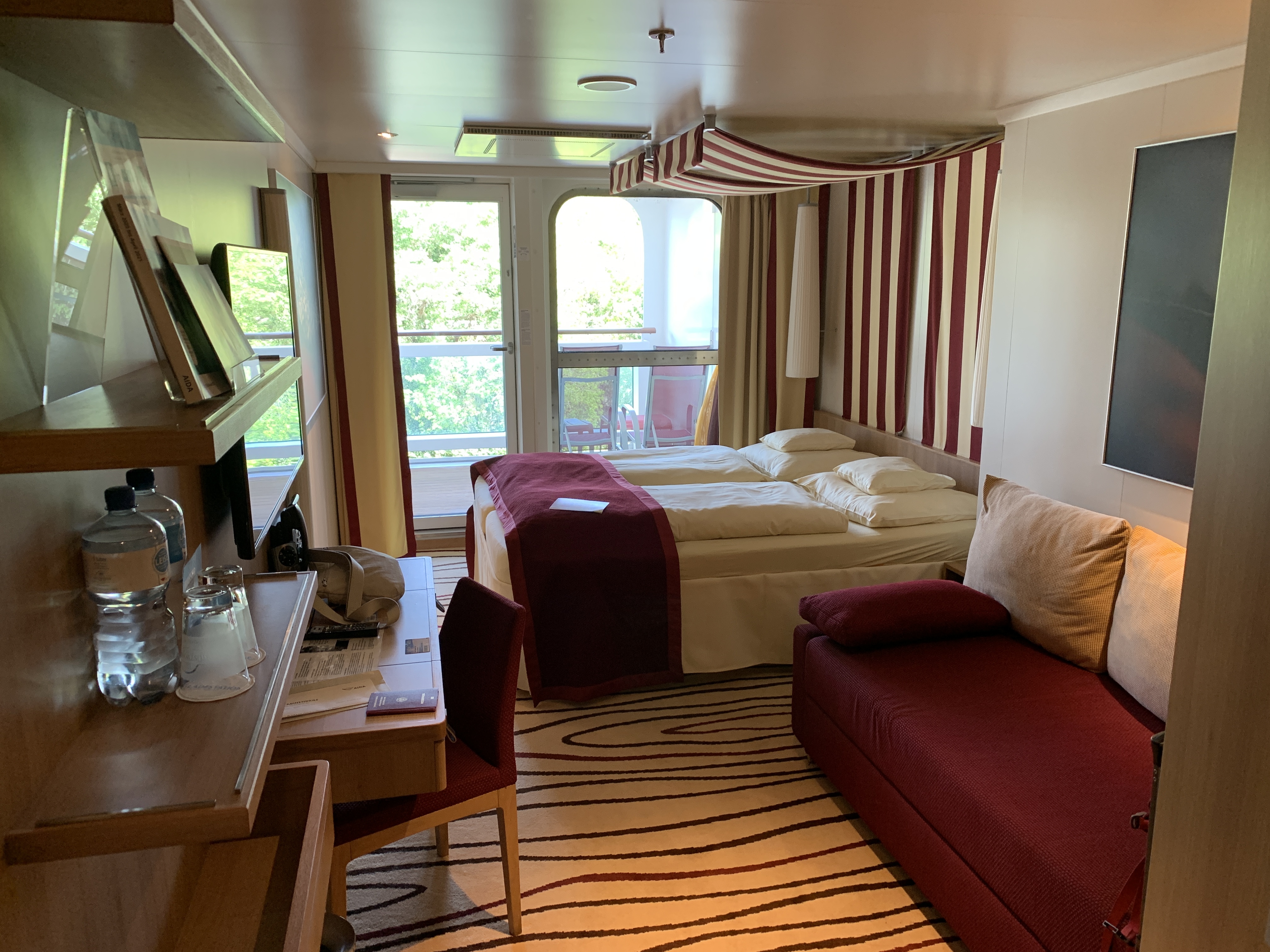 Es handelt sich um eine Veranda Komfort Kabine für bis zu 3 Personen mit begehbarem Kleiderschrank. Es sind leise Geräusche aus dem Raum darunter zu hören. Stört aber nicht wirklich-sind aber wahrzunehmen. Balkon direkt mit Blick zum Wasser. Ausstattung der Kabine sehr schön. Doppelbett auf der rechten Seite und davor ein Sofa, welches mit Matraze zum Bett wird und auch sehr bequem ist.