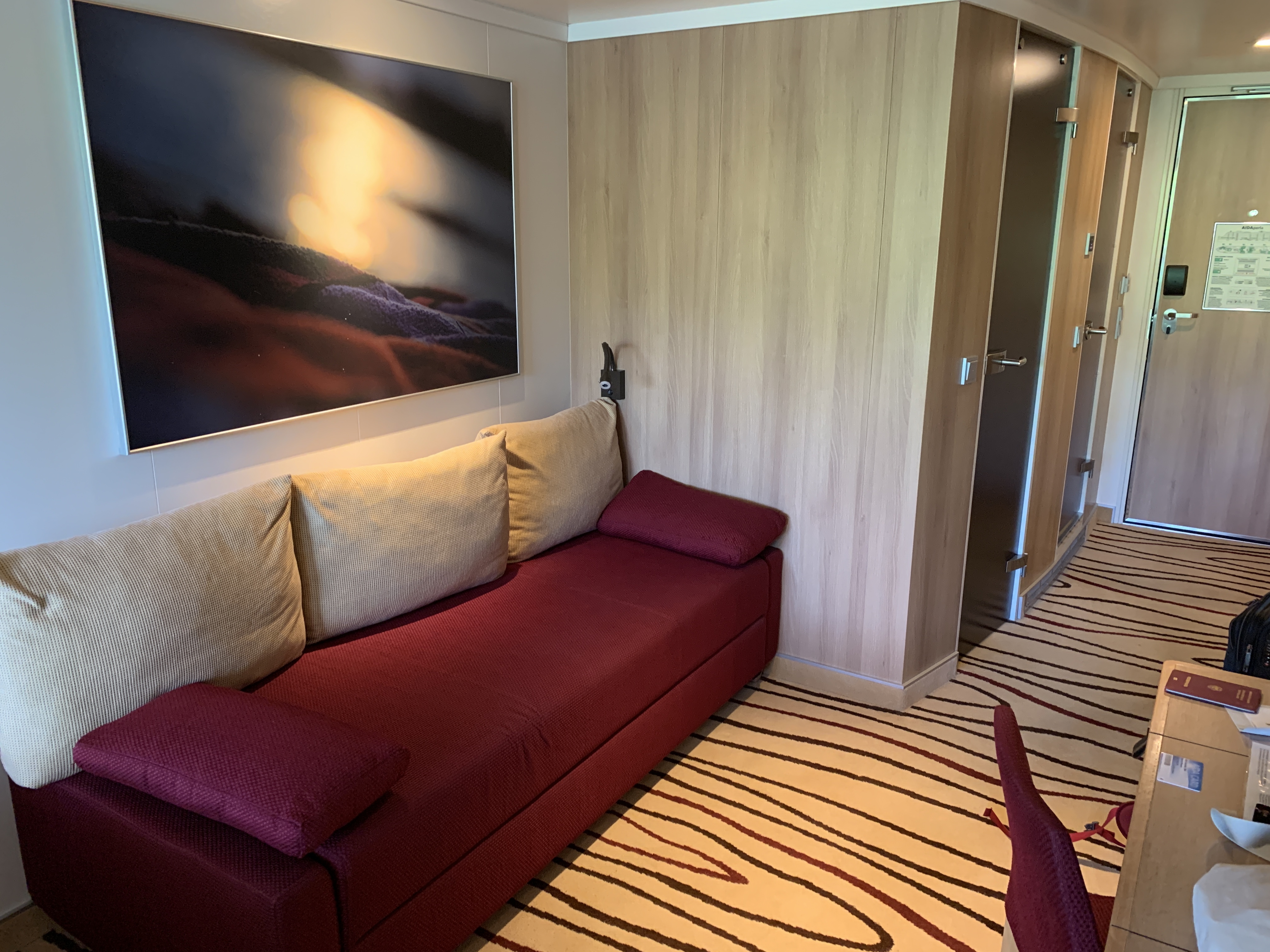 Es handelt sich um eine Veranda Komfort Kabine für bis zu 3 Personen mit begehbarem Kleiderschrank. Es sind leise Geräusche aus dem Raum darunter zu hören. Stört aber nicht wirklich-sind aber wahrzunehmen. Balkon direkt mit Blick zum Wasser. Ausstattung der Kabine sehr schön. Doppelbett auf der rechten Seite und davor ein Sofa, welches mit Matraze zum Bett wird und auch sehr bequem ist.