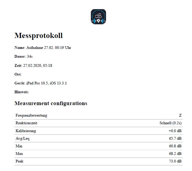 Am 27. nachts habe ich mit dem Ipad und der App DecibelX eine Lärmmessung gemacht. Das Ergebnis war ein Mittelwert von 65,7 dB.