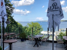 Einen wunderbaren Ausblick auf die Förde bietet die (öffentliche) Dachterrasse des Maritim-Hotels "Bellevue". Die Auswahl der Speisen ist geringer, aber geschmeckt hat es sehr. Vielleicht auch etwas für den abendlichen Absacker. Ist aber genauso weit draußen, wie die Seebar (liegt genau über ihr).
