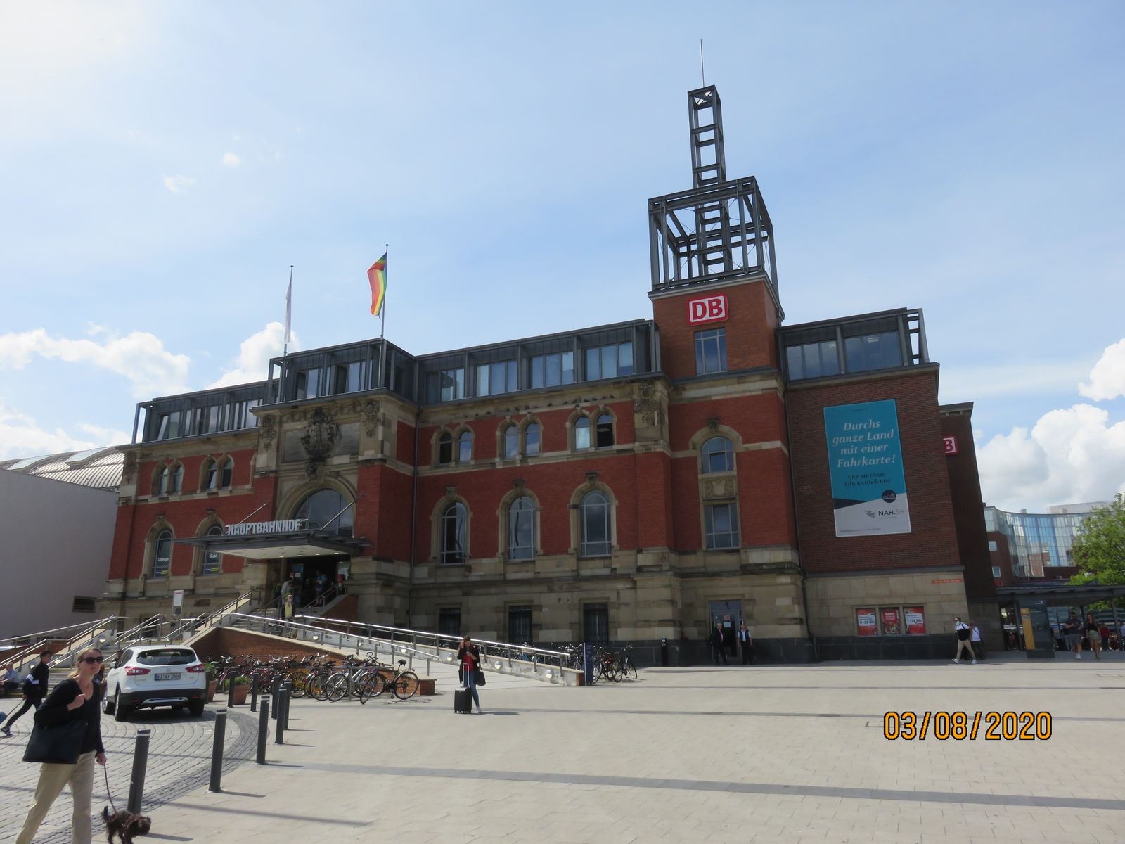 1) Bahnhof über den Ausgang in die Richtung verlassen, in welche die Züge in den Bahnhof hineinfahren (Kiel ist ein Sackbahnhof# so raus aus dem Bahnhof, wohin die Gleise weiter gehen würden, wenn die nicht enden würden). Denn über den Ausgang gibt es u.a. Rolltreppe und Schiefe Ebenen zum Rollen