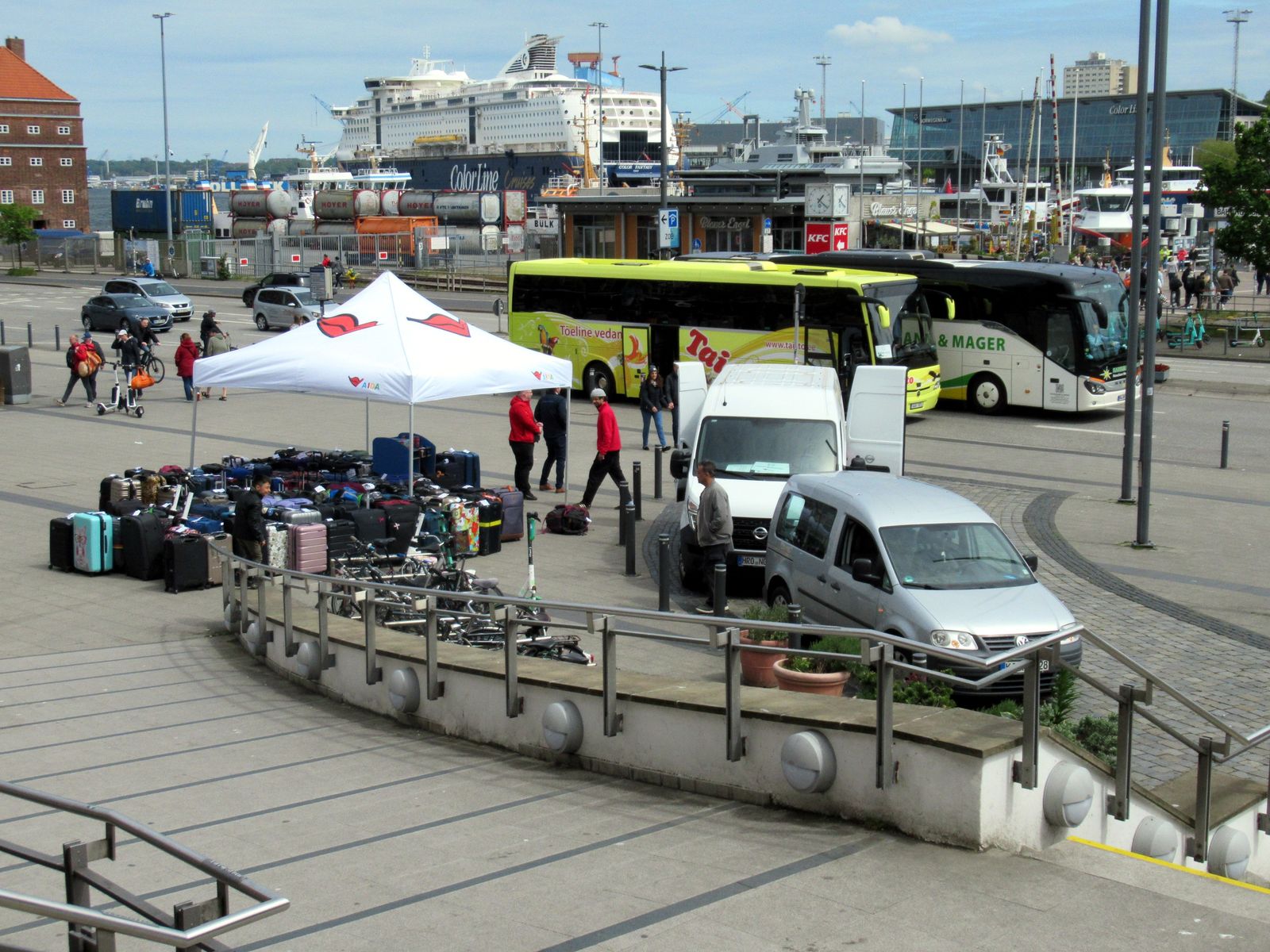 Ihr könnt sie dort abgeben und ähnlich wie in Warnemünde am Ende vom Bahnsteig, werden sie ohne euch zum Schiff gebracht. -Kostenlos- Zumindest war es vor einem Jahr noch so. Ist im Grunde also nicht anders, als sie vor dem Schiff abzugeben.