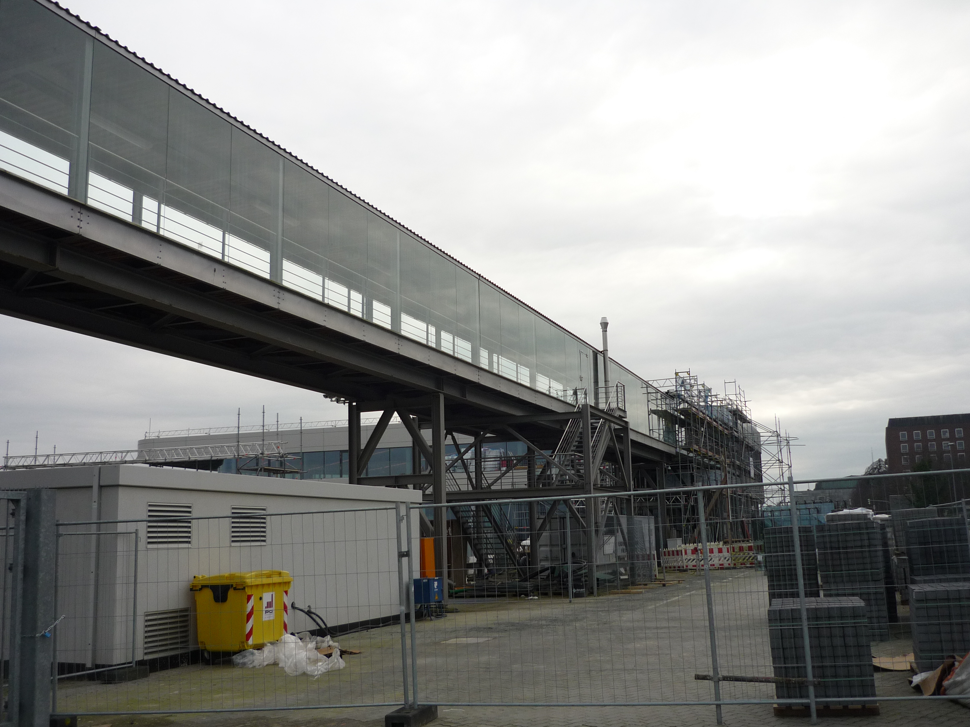 Im Hintergrund vom Terminal (hinter dem Baugerüst) geht die lange,gläserne Passagierbrücke vom Terminal zum Schiff (wie früher auch)
