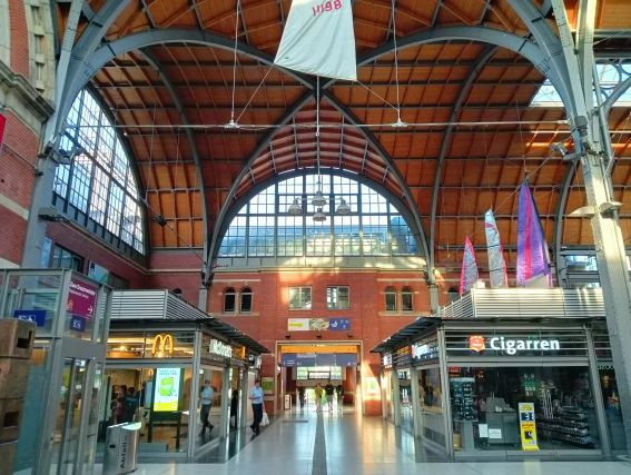 Zwischen dem Tabakgeschäft und dem "Restaurant mit dem goldenen M" läuft man nun zum Ausgang mit der Beschriftung "Kaistraße". Hier die Treppen nehmen und schon steht man an dem Ausgang, der direkt zum Bahnhofsvorplatz führt, wo immer die Kofferabgabe erfolgt: