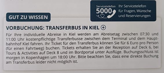 gurke1234 , solltest du also darüber nachdenken, den Shuttle bei Rückkehr buchen zu wollen, schau am besten wegen des Buchungsschlusses in die "AIDA heute".