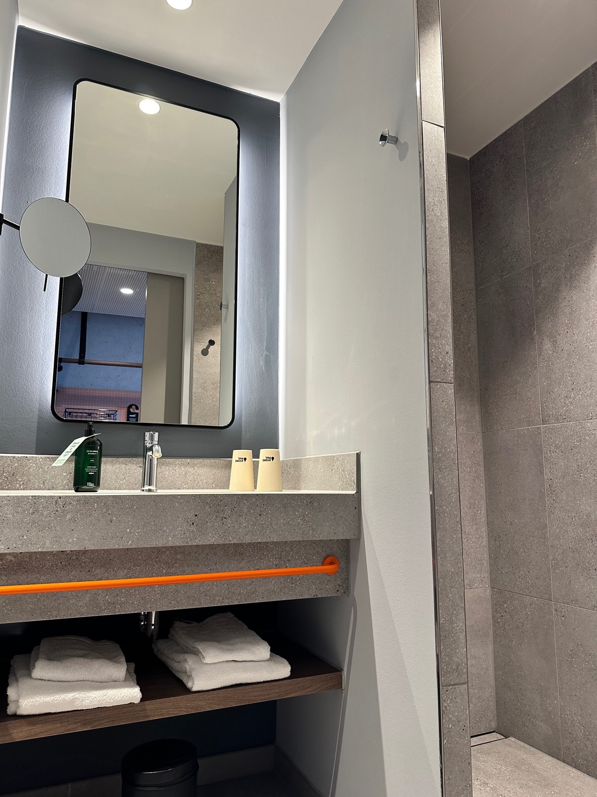 Die Dusche fand ich auch sehr geräumig. Das Bad war bei mir durch eine Schiebetür vom Zimmer getrennt.