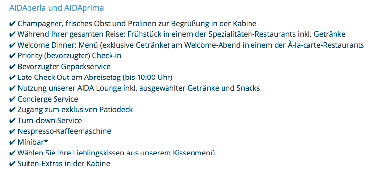 Hallo, die Leistungen sind abhängig von der Schiffskategorie. Die "Grossen " haben zusätzlich zu den allgemeinen Leistungen ( Welcome Menü, Champus zur Begrüßung , Frühstück im BedienRestaurant) noch eine zusätzliche Lounge, also einen abgetrennten Bereich für Suitengäste, wo es diverse Getränke und kleinere Speisen gibt.