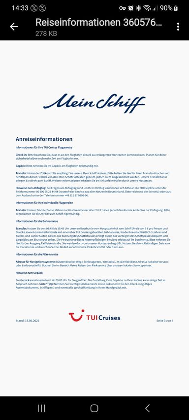 Hier die aktuellen Anreiseinfos, gerade heute Nacht erhalten. Wir starten in 14 Tagen. Kostet p. P. ab 3 Jahre 5 Euro pro Strecke und startet 8:45 Euro. Kostenlos nur für Suiten und über TUI gebuchter Bahnanreise.