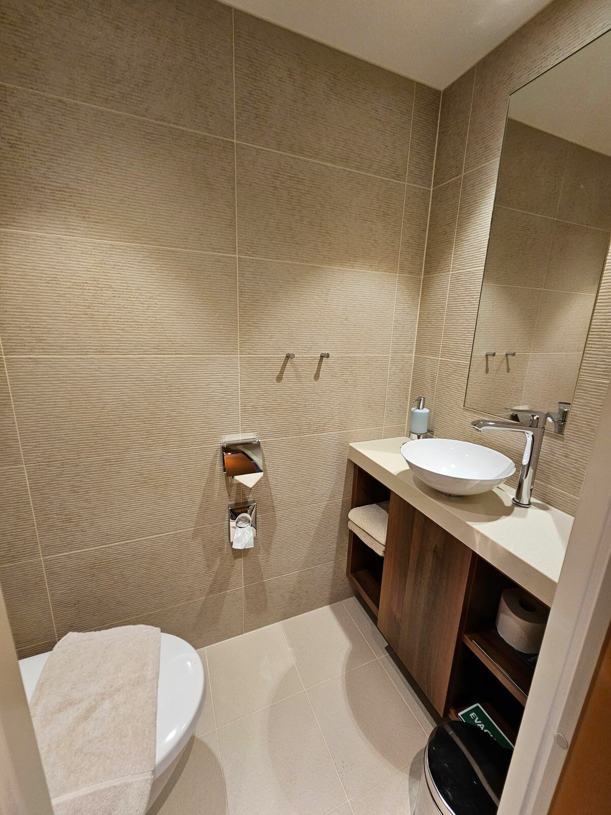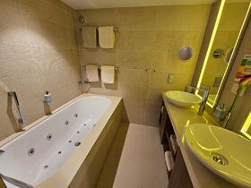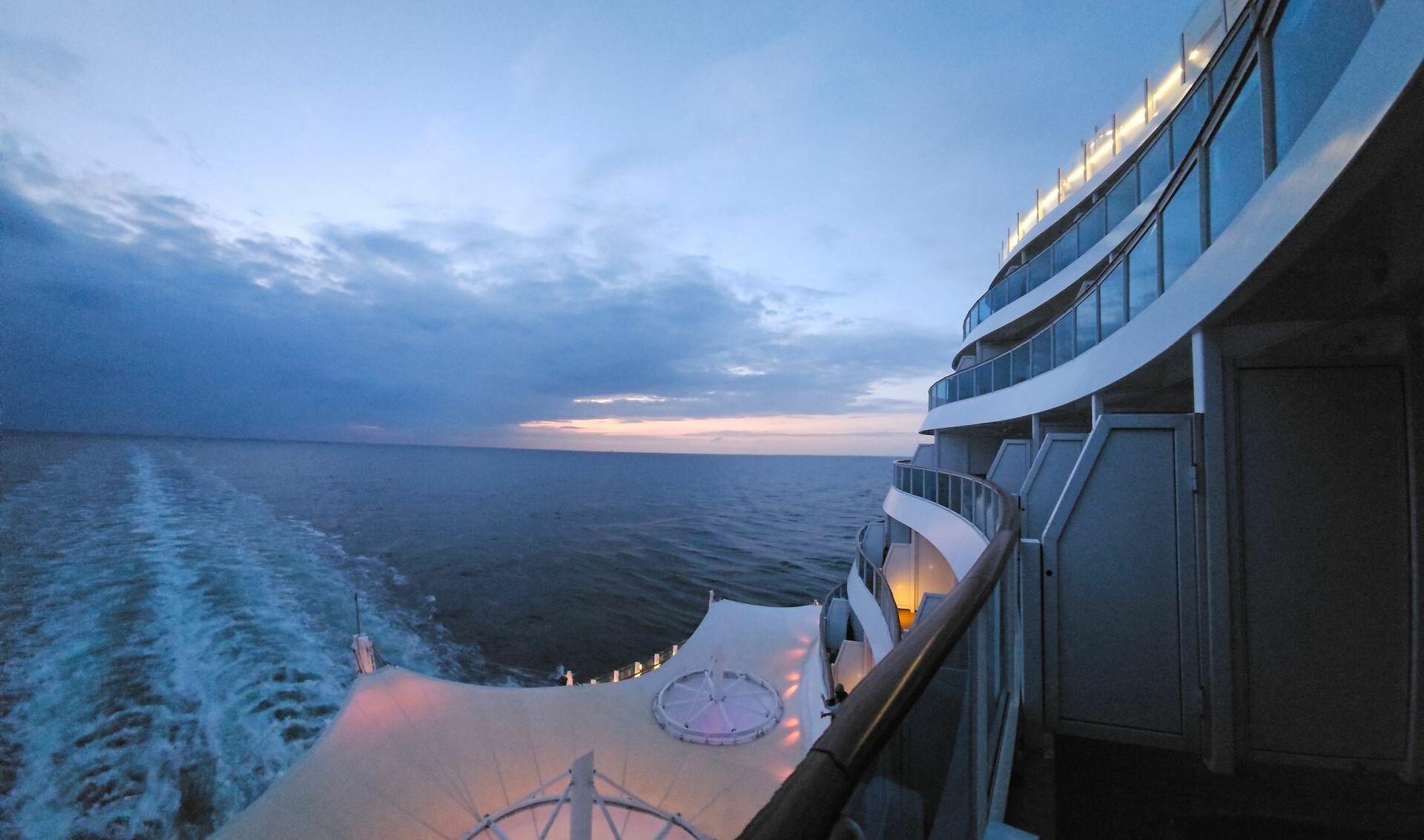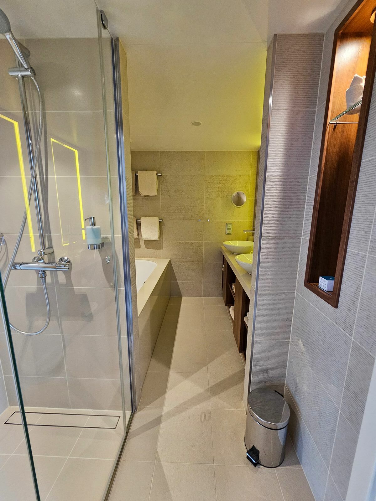 Bei der Buchung war es wichtig, ein separates Schlafzimmer in der Kabine zu haben. Leider gab es bei der Buchung ein halbes Jahr vorher keine genauen Grundrisse, die Reiseberater an Bord wussten auch nichts seinerzeit. Also, wir waren sehr zufrieden. Ein sep. WC ist gleich am Eingang zur Suite, am Ende eines kleinen Flures, der beidseitig mit Einbauschränken versehen ist. Das eigentlich Bad besteht aus 2 Waschbecken, Dusche und Sprudelwanne. Ablagefächer und Haken für Bademantel waren vorhanden. Das sep. Schlafzimmer ist ca. 12qm groß, mit großem Spiegel, Föhn, Schränkchen und Doppelbett. Für Tageslicht ist die Wand zur dahinterliegenden Couch \ Wohnbereich zur Terrasse mit einer großen Glasscheibe versehen, in dieser ist auch ein Rollladen integriert, welcher sich motorisch öffnen und schließen lassen. So sind Einblicke in das Schlafzimmer nicht möglich. Ein großer Tisch mit Platz für 4 Personen stand im Zimmer, eine Couch, welche sich als Doppelbett verändern lässt. Eine Minibar und Kaffeemaschine sind vorhanden, sowie ein weiterer großer Fernseher. Highlight ist sicher die große, geschätzt von mir 20-24qm große Terrasse mit einem Tisch und 4 Stühlen, sowie 2 großen Liegen jeweils aus Teak.