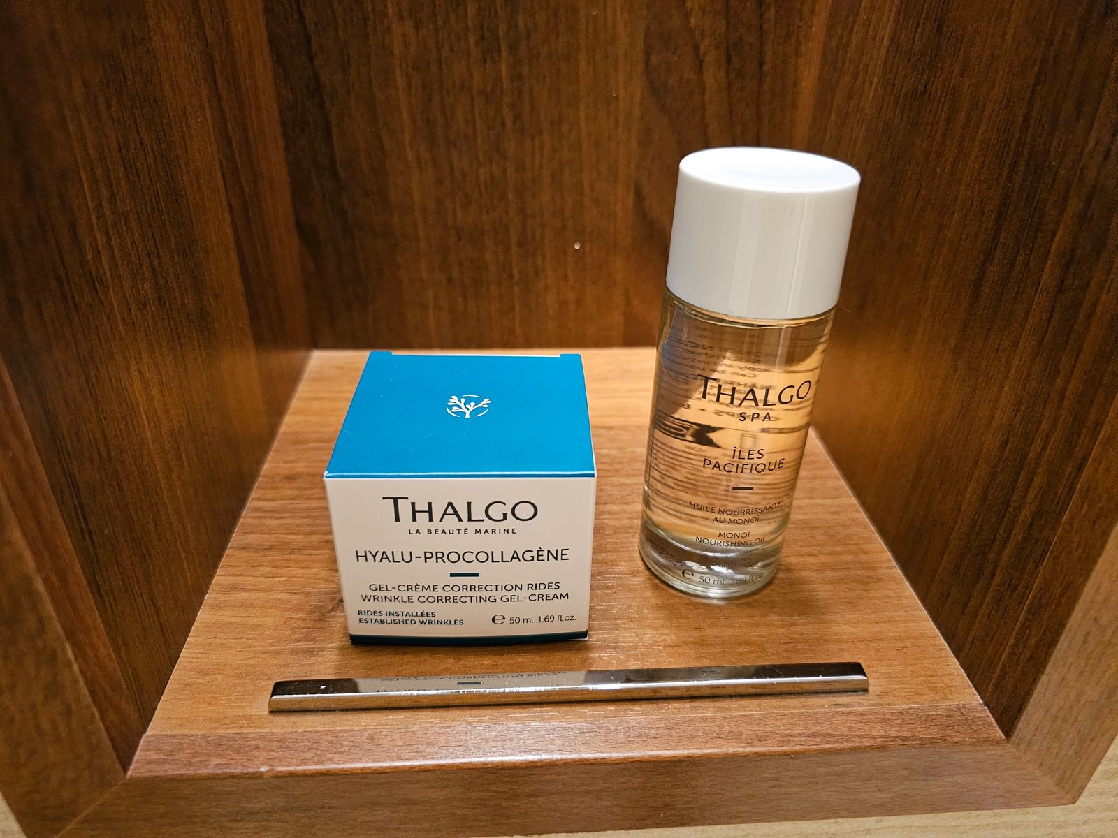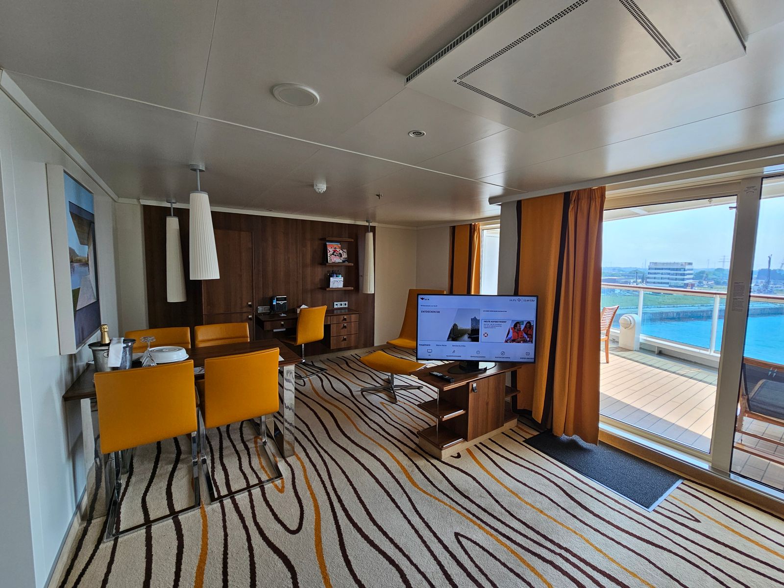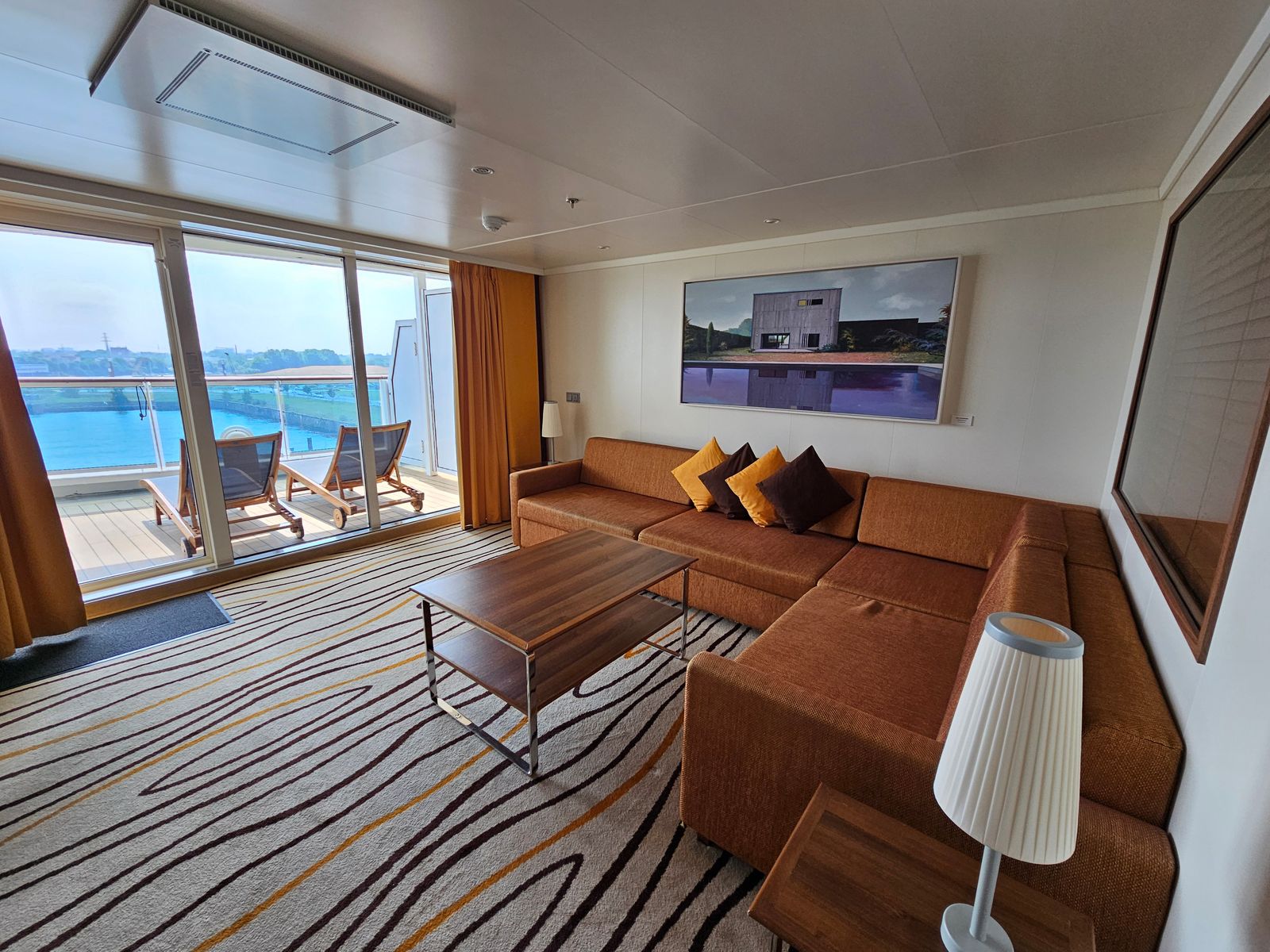 Bei der Buchung war es wichtig, ein separates Schlafzimmer in der Kabine zu haben. Leider gab es bei der Buchung ein halbes Jahr vorher keine genauen Grundrisse, die Reiseberater an Bord wussten auch nichts seinerzeit. Also, wir waren sehr zufrieden. Ein sep. WC ist gleich am Eingang zur Suite, am Ende eines kleinen Flures, der beidseitig mit Einbauschränken versehen ist. Das eigentlich Bad besteht aus 2 Waschbecken, Dusche und Sprudelwanne. Ablagefächer und Haken für Bademantel waren vorhanden. Das sep. Schlafzimmer ist ca. 12qm groß, mit großem Spiegel, Föhn, Schränkchen und Doppelbett. Für Tageslicht ist die Wand zur dahinterliegenden Couch \ Wohnbereich zur Terrasse mit einer großen Glasscheibe versehen, in dieser ist auch ein Rollladen integriert, welcher sich motorisch öffnen und schließen lassen. So sind Einblicke in das Schlafzimmer nicht möglich. Ein großer Tisch mit Platz für 4 Personen stand im Zimmer, eine Couch, welche sich als Doppelbett verändern lässt. Eine Minibar und Kaffeemaschine sind vorhanden, sowie ein weiterer großer Fernseher. Highlight ist sicher die große, geschätzt von mir 20-24qm große Terrasse mit einem Tisch und 4 Stühlen, sowie 2 großen Liegen jeweils aus Teak.