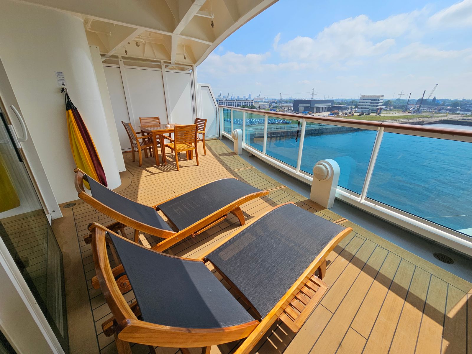 Bei der Buchung war es wichtig, ein separates Schlafzimmer in der Kabine zu haben. Leider gab es bei der Buchung ein halbes Jahr vorher keine genauen Grundrisse, die Reiseberater an Bord wussten auch nichts seinerzeit. Also, wir waren sehr zufrieden. Ein sep. WC ist gleich am Eingang zur Suite, am Ende eines kleinen Flures, der beidseitig mit Einbauschränken versehen ist. Das eigentlich Bad besteht aus 2 Waschbecken, Dusche und Sprudelwanne. Ablagefächer und Haken für Bademantel waren vorhanden. Das sep. Schlafzimmer ist ca. 12qm groß, mit großem Spiegel, Föhn, Schränkchen und Doppelbett. Für Tageslicht ist die Wand zur dahinterliegenden Couch \ Wohnbereich zur Terrasse mit einer großen Glasscheibe versehen, in dieser ist auch ein Rollladen integriert, welcher sich motorisch öffnen und schließen lassen. So sind Einblicke in das Schlafzimmer nicht möglich. Ein großer Tisch mit Platz für 4 Personen stand im Zimmer, eine Couch, welche sich als Doppelbett verändern lässt. Eine Minibar und Kaffeemaschine sind vorhanden, sowie ein weiterer großer Fernseher. Highlight ist sicher die große, geschätzt von mir 20-24qm große Terrasse mit einem Tisch und 4 Stühlen, sowie 2 großen Liegen jeweils aus Teak.
