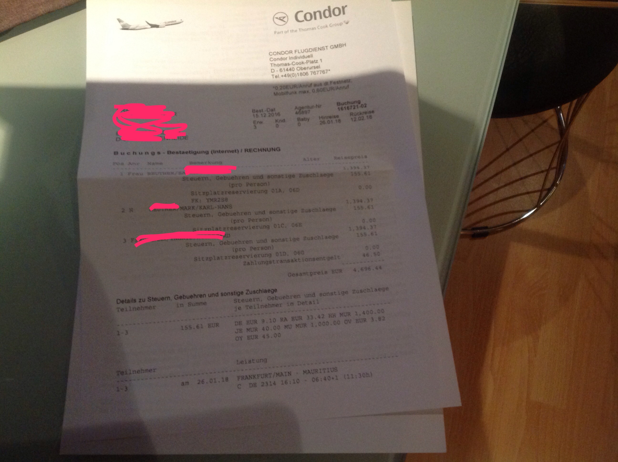 Hallo wir zahlen für den Flug Buisness hin und Premium Economy pro Person 1499€.