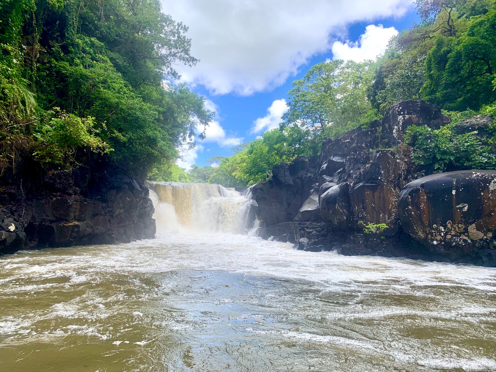 Nach einem knapp Einstündigen Transfer stiegen wir mit ca. 10 - 15 Personen auf den Motorkatamaran und fuhren durch türkisblaues Wasser des indischen Ozeans zunächst zu einem Schnorchelstop. Anschließend ging es zu einem Wasserfall, zu dem wir mit einem kleinen Motorboot übersetzten. Währenddessen bereitete die Crew das Mittagessen auf dem Grill zu.