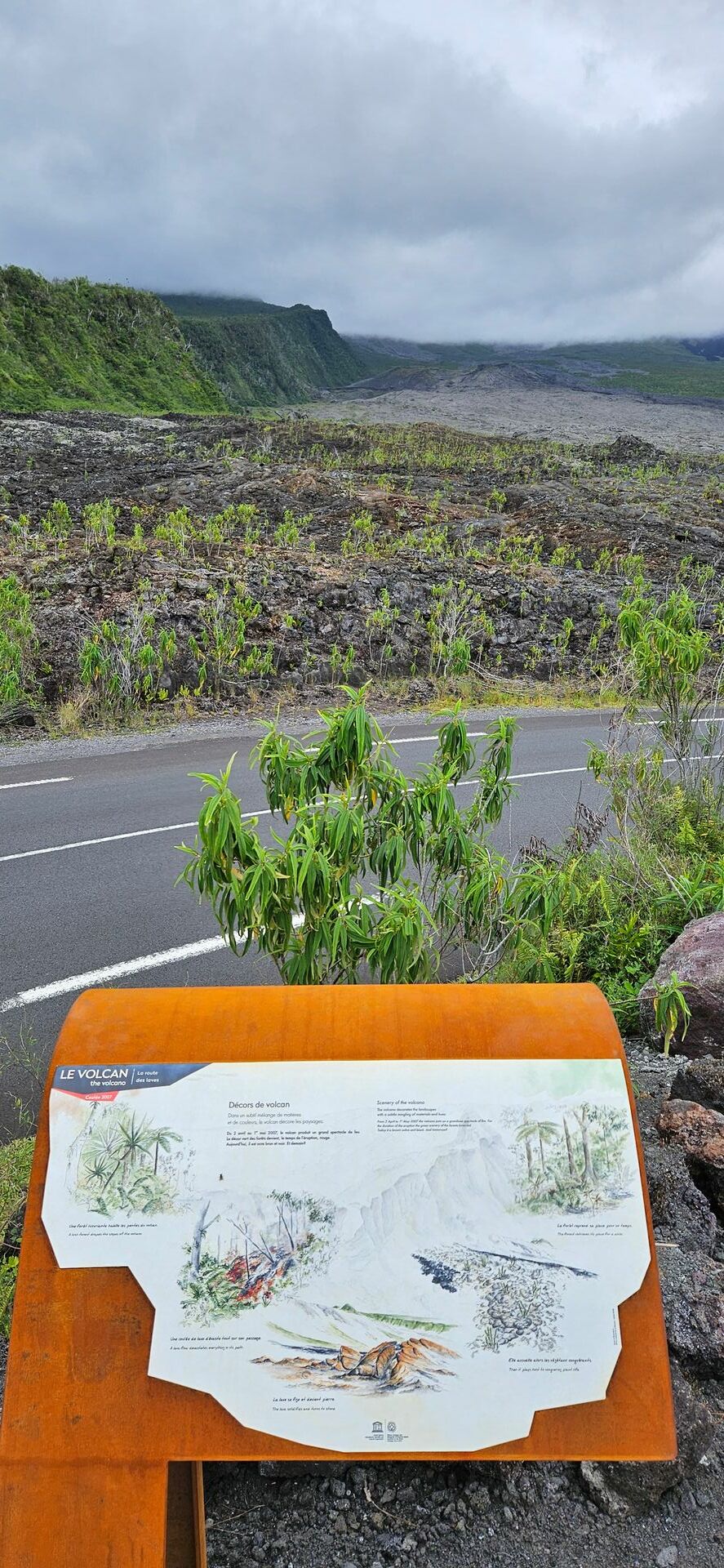 Anschließend fuhren wir weiter über die Autobahn Richtung des Vulkans Piton de la Fournaise. Plötzlich gab es einen lauten Knall und ein Reifen unseres Buses war geplatzt. Zum Glück befand sich die Busfirma in unmittelbarer Nähe, sodass wir von der Autobahn abfuhren und nach ca. 20 Minuten ein Ersatzbus vor Ort war.