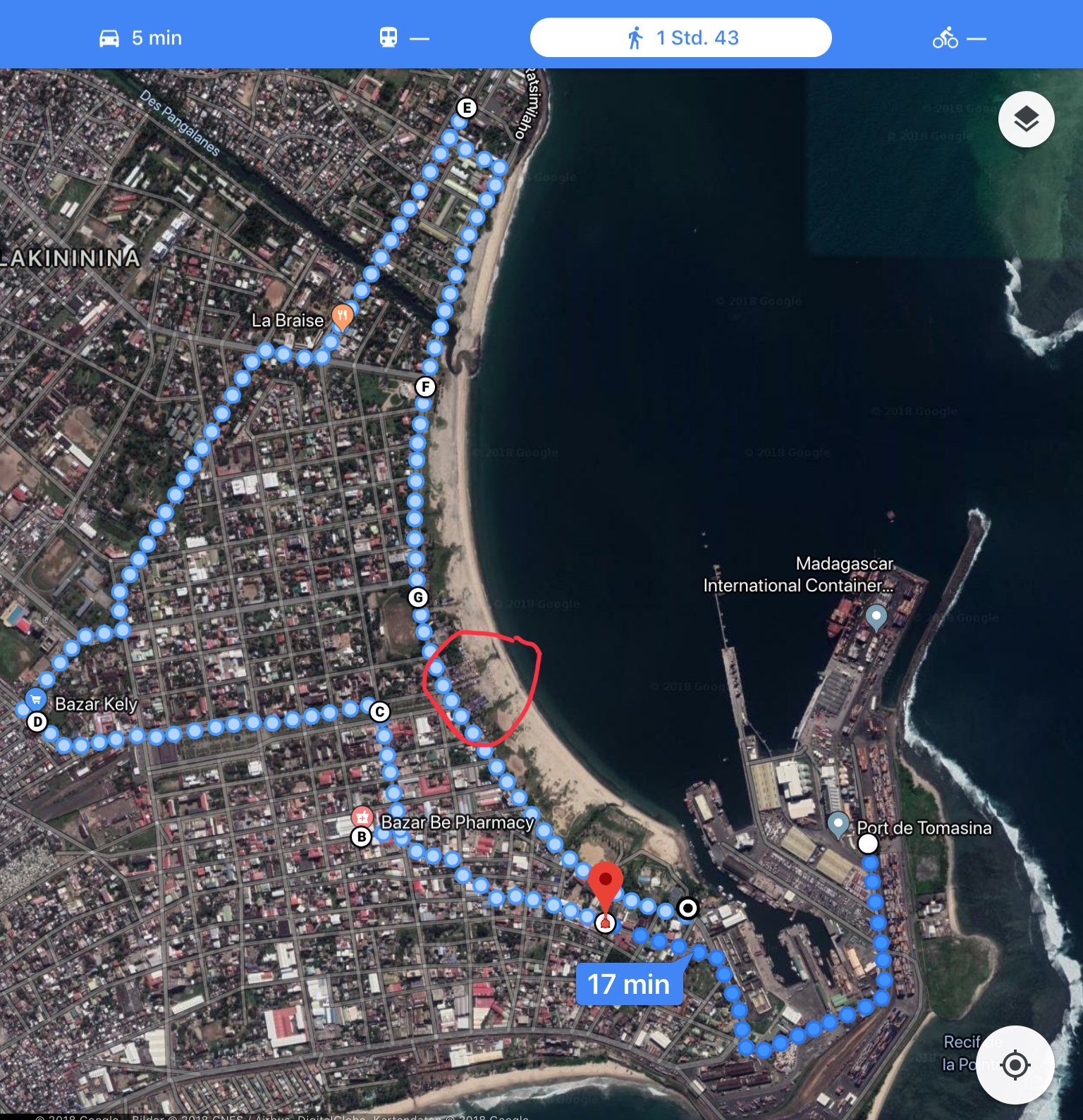 Starten am Hafen zur Rue du Commerce...hier in Richtung des Bazar Be ( größter Markt) weiter auf dem Blvd Joffre zum Parkähnlich angelegten Avenue de l independance ..links hoch zum Bazar Kely ( noch ein Markt soll urig sein durch den danebenliegen Bahnhof ) weiter gehts zum Point Tanio Leuchtturm.