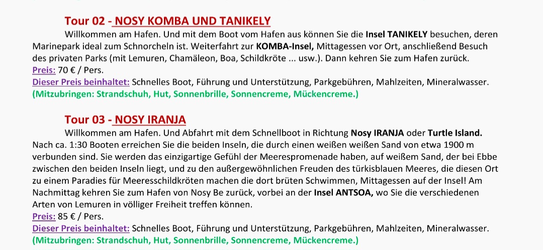 Wir machen heuer im November diese Reise und haben bereits auch bei MAD EX gebucht. Jedoch am ersten Tag TSINGY ROT UND RAMENA und am zweiten Tag Nosy Iranja.