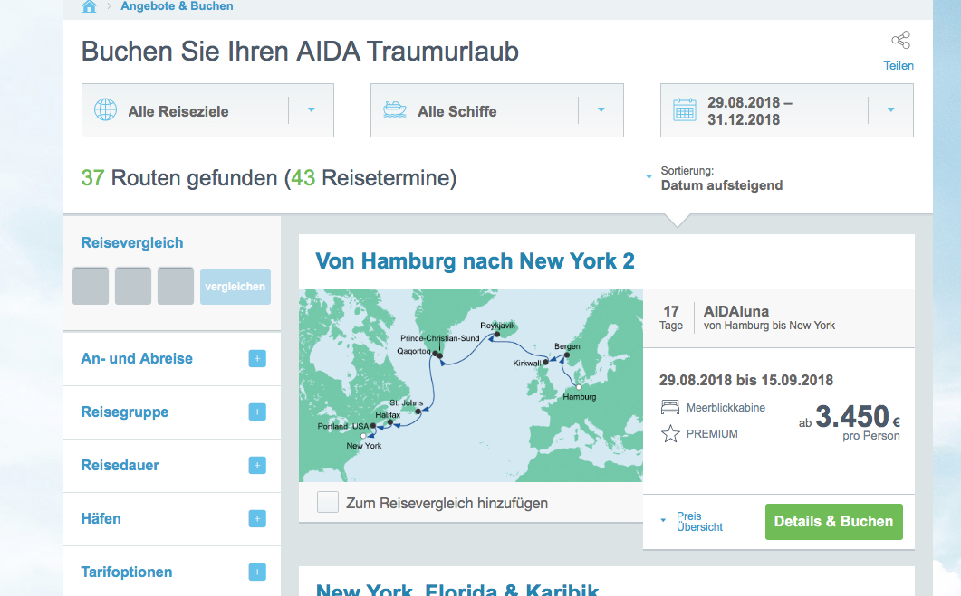 Ich persönlich finde die Suche nach einer passenden Reise, und den besten Preis, auch sehr unübersichtlich bei Aida.
