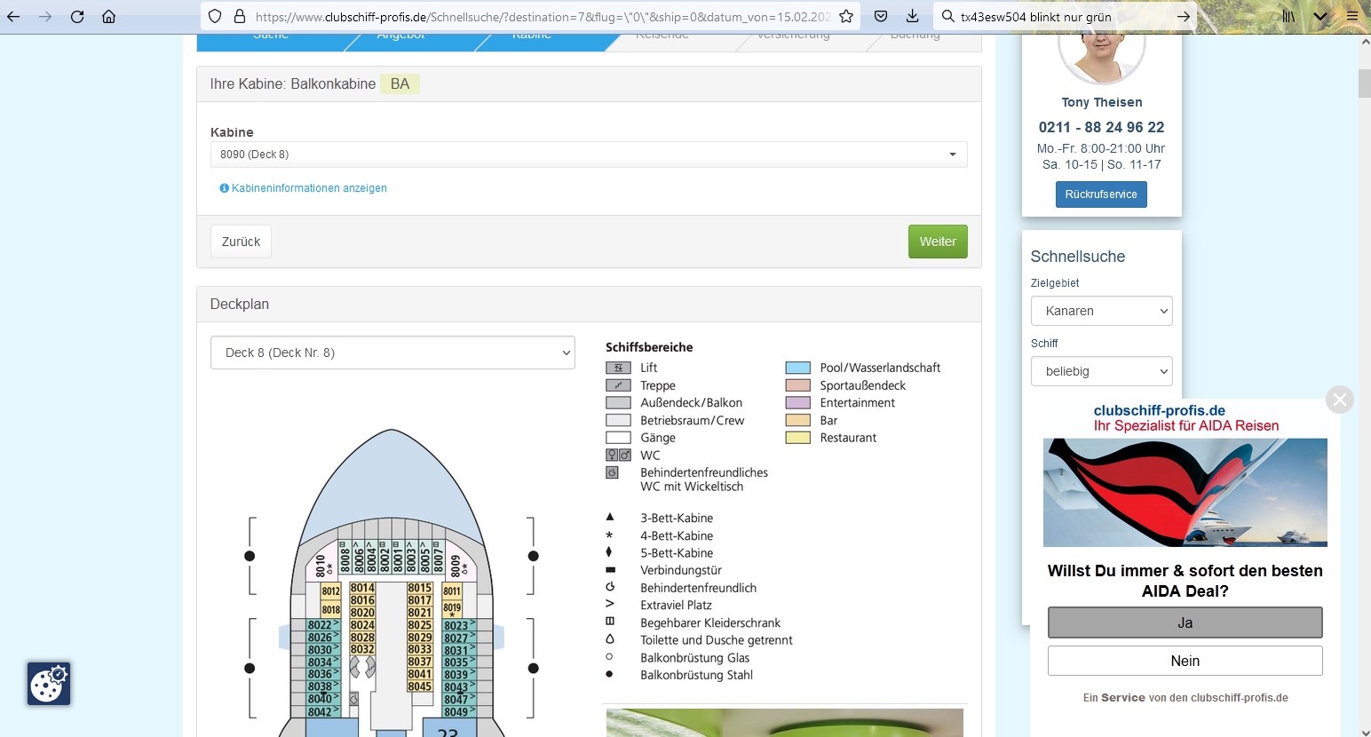 Nur zur Erklärung für Mitlesende, die freien Kabinen sind über die Drop-Down-Liste sofort sichtbar, in der Aida Maske wird zwar sofort die Lage angezeigt aber dafür immer nur ein paar wenige freie Kabinen im schematischen Deckplan.