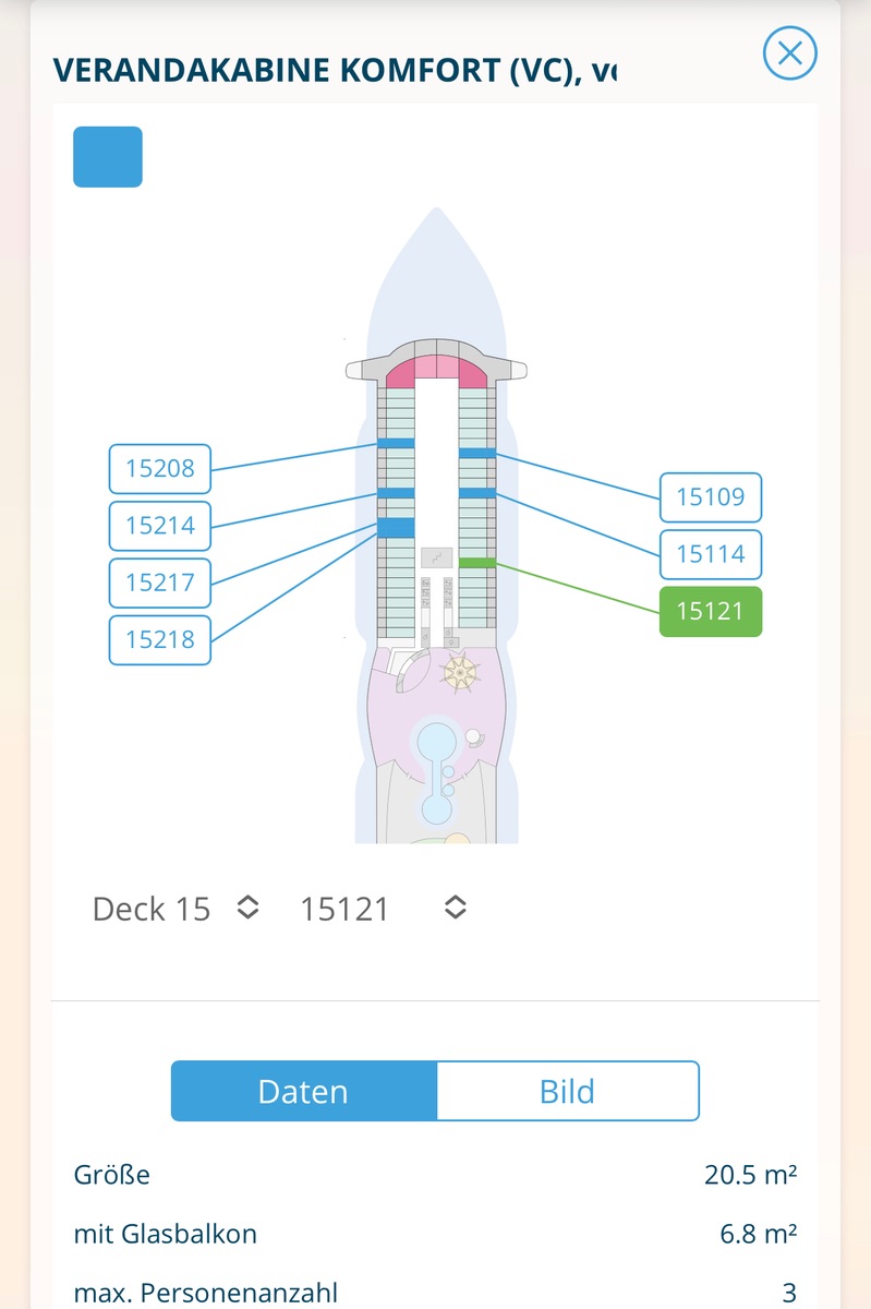 Nur zur Erklärung für Mitlesende, die freien Kabinen sind über die Drop-Down-Liste sofort sichtbar, in der Aida Maske wird zwar sofort die Lage angezeigt aber dafür immer nur ein paar wenige freie Kabinen im schematischen Deckplan.
