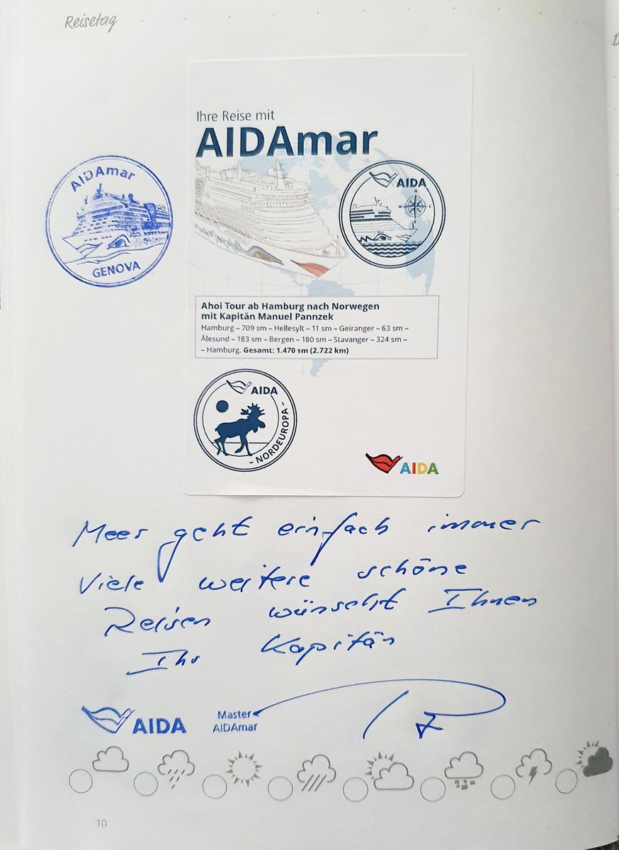Ich hatte auf AIDAmar im September das Glück zusätzlich zur Karte einen Eintrag von Kapitän zu bekommen.