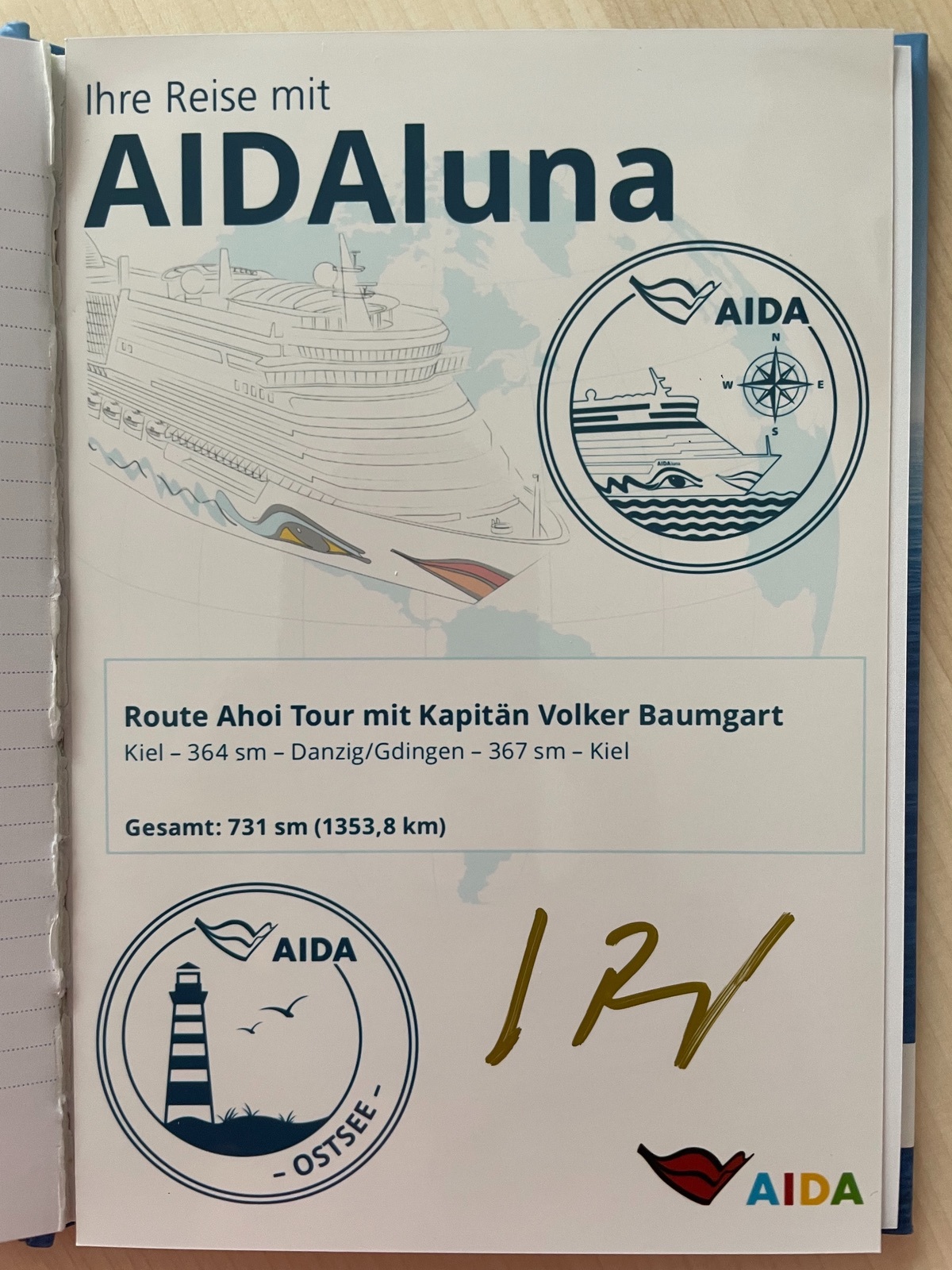 Ich habe auf meinen beiden Kurztouren mit der Sol wie immer die passenden Routenaufkleber, Schiffs-und Destinationsstempel und Unterschrift (plus Spruch) vom Kapitän bekommen.